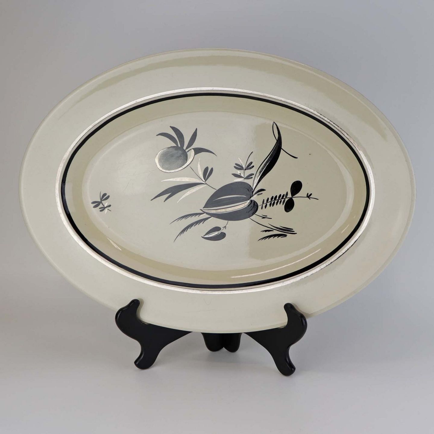 Råhvidt fajancestel i stelform E med dekoration af naturmotiver i sølv og sort farve.