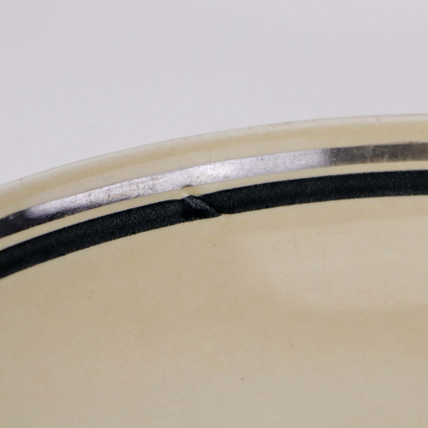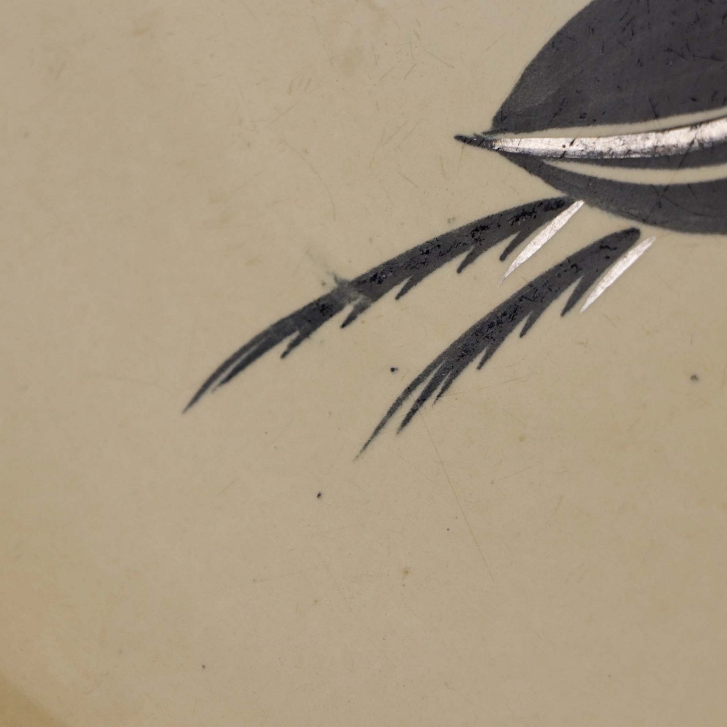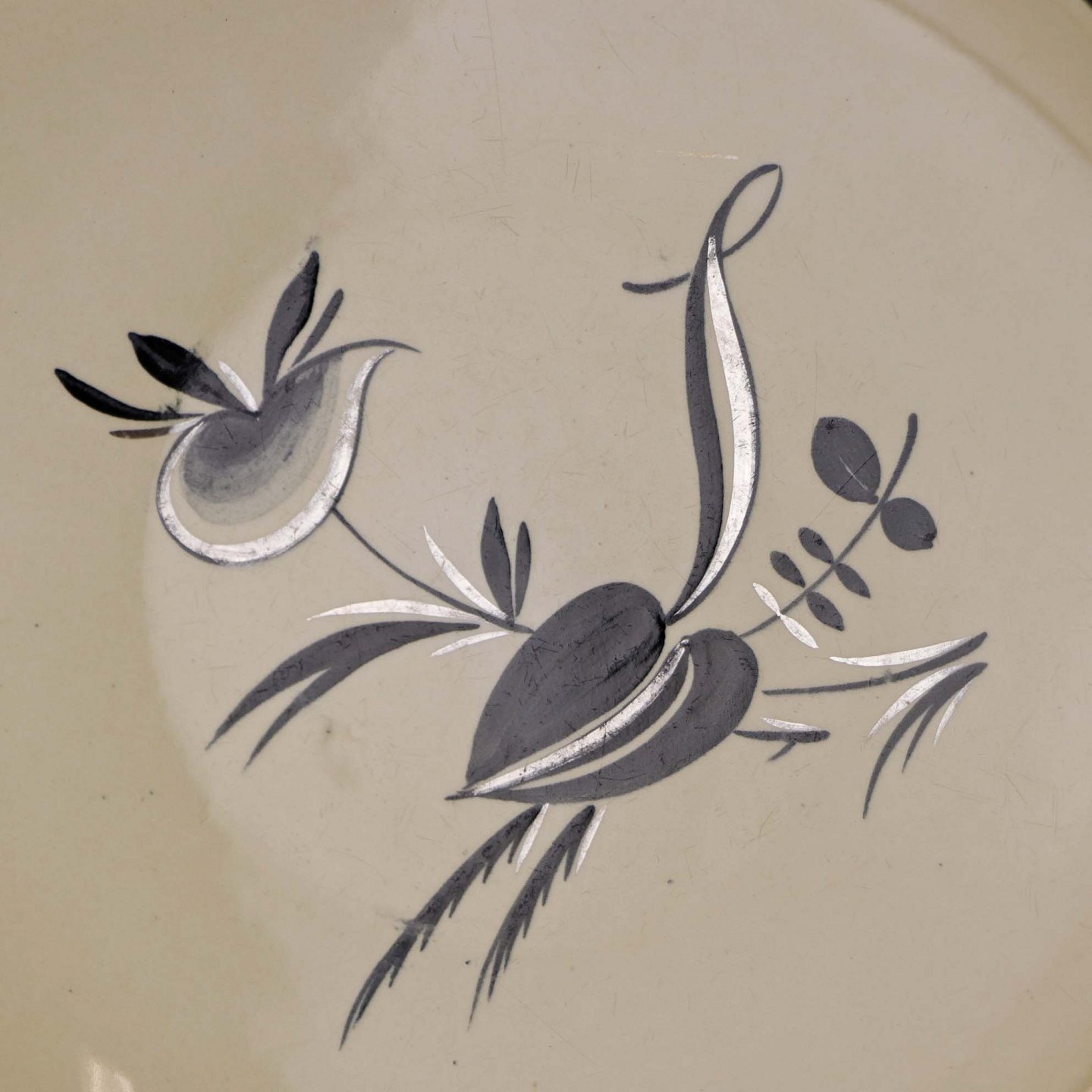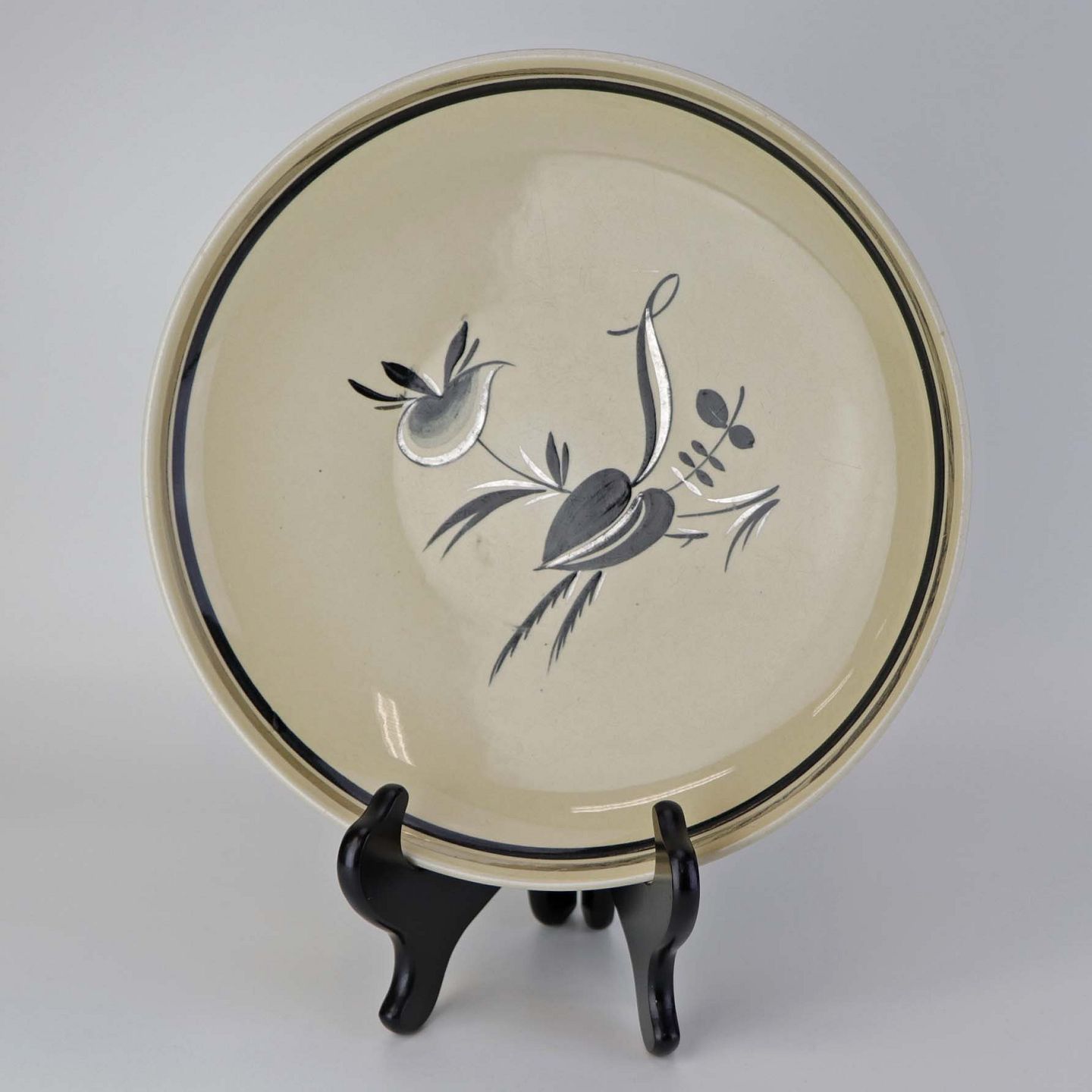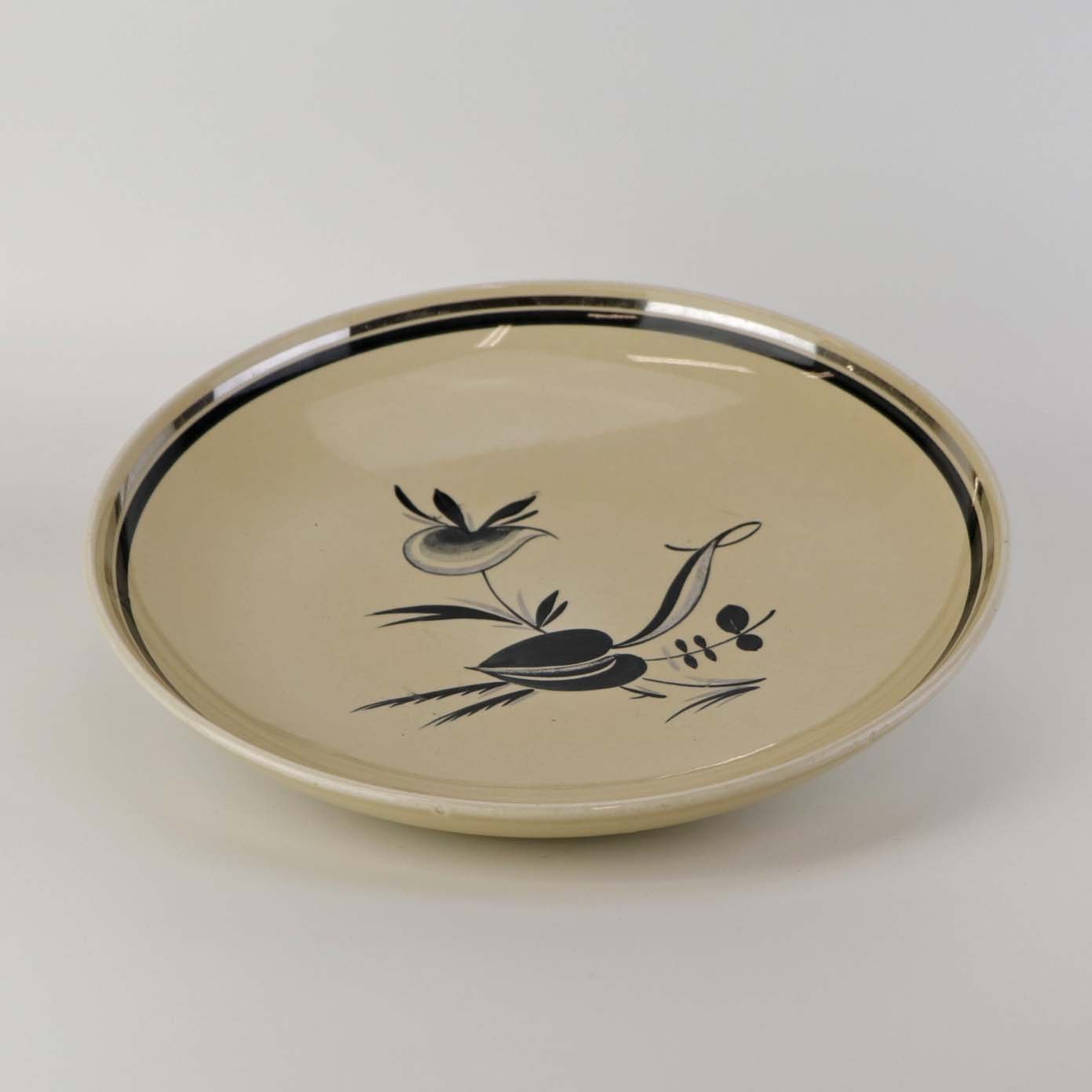 Råhvidt fajancestel i stelform E med dekoration af naturmotiver i sølv og sort farve.
