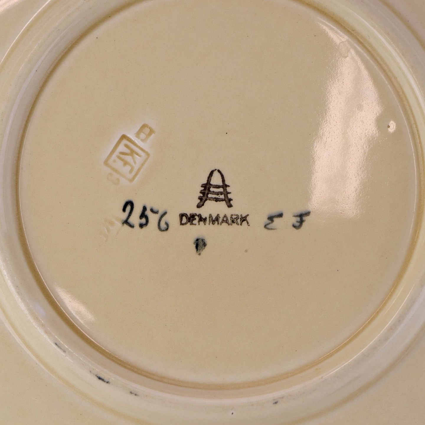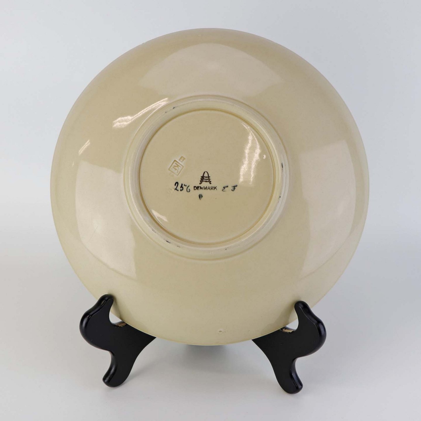 Rundt kagefad i fajance fra stellet Dragsholm fremstillet i perioden 1934-1965. Nr 256