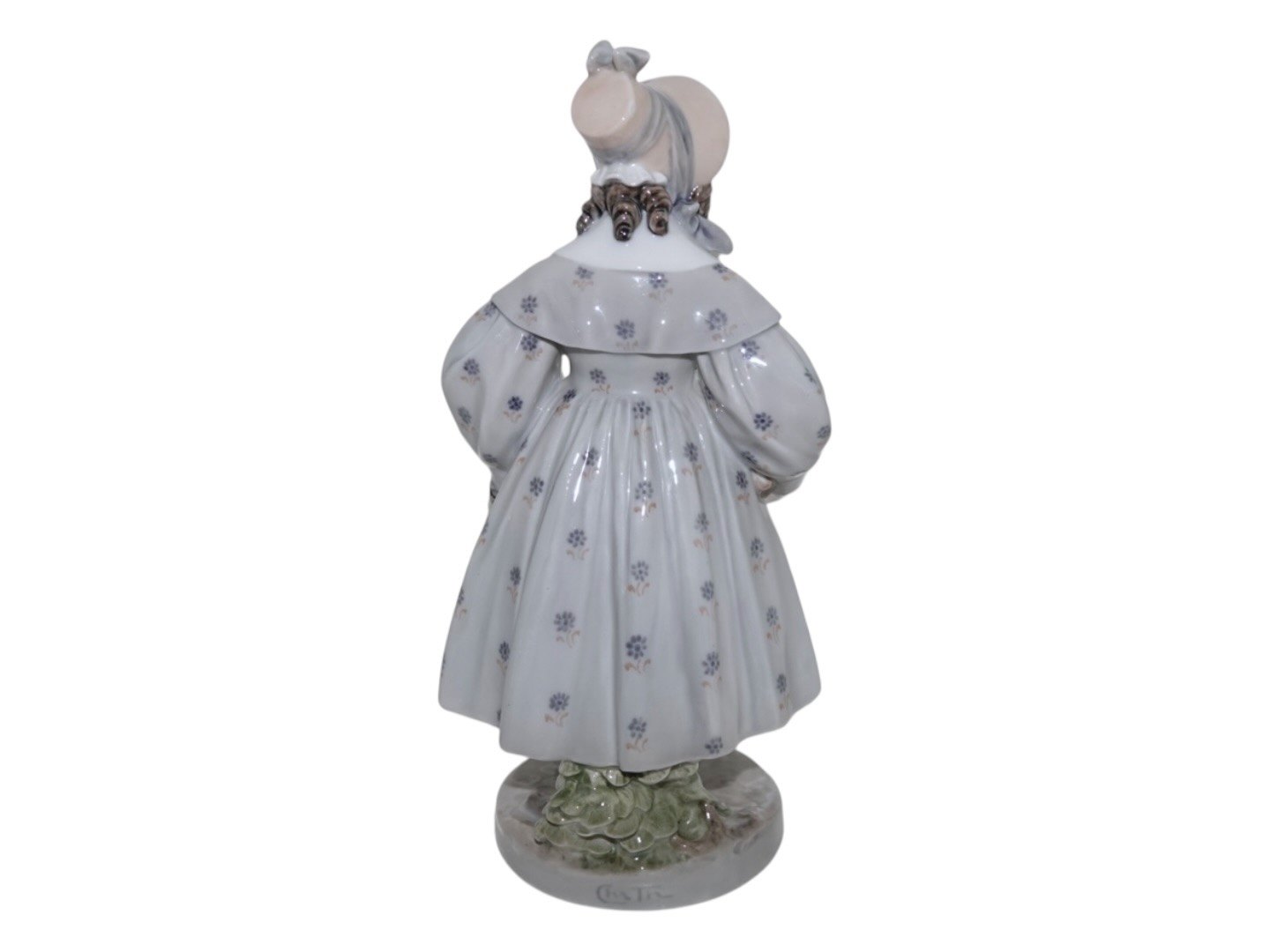 Royal Copenhagen Art Nouveau, sjælden figur af pige i fin frakke med parably og bog.