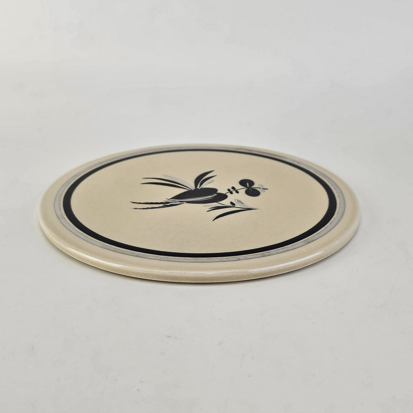 Råhvidt fajancestel i stelform E med dekoration af naturmotiver i sølv og sort farve.