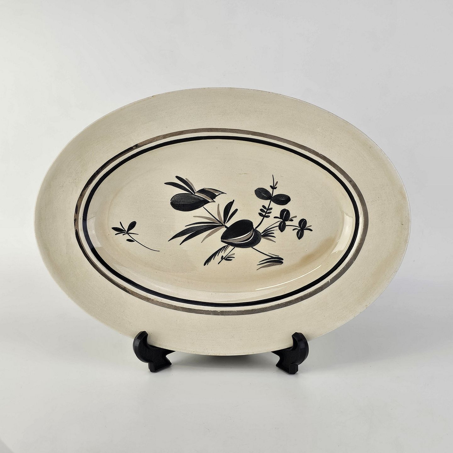 Råhvidt fajancestel i stelform E med dekoration af naturmotiver i sølv og sort farve.