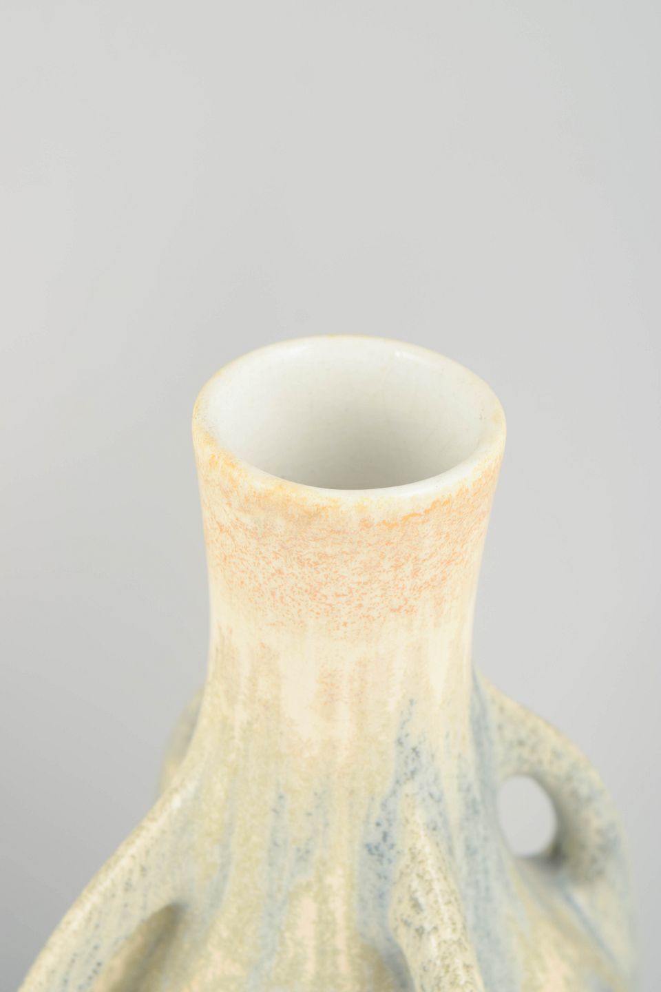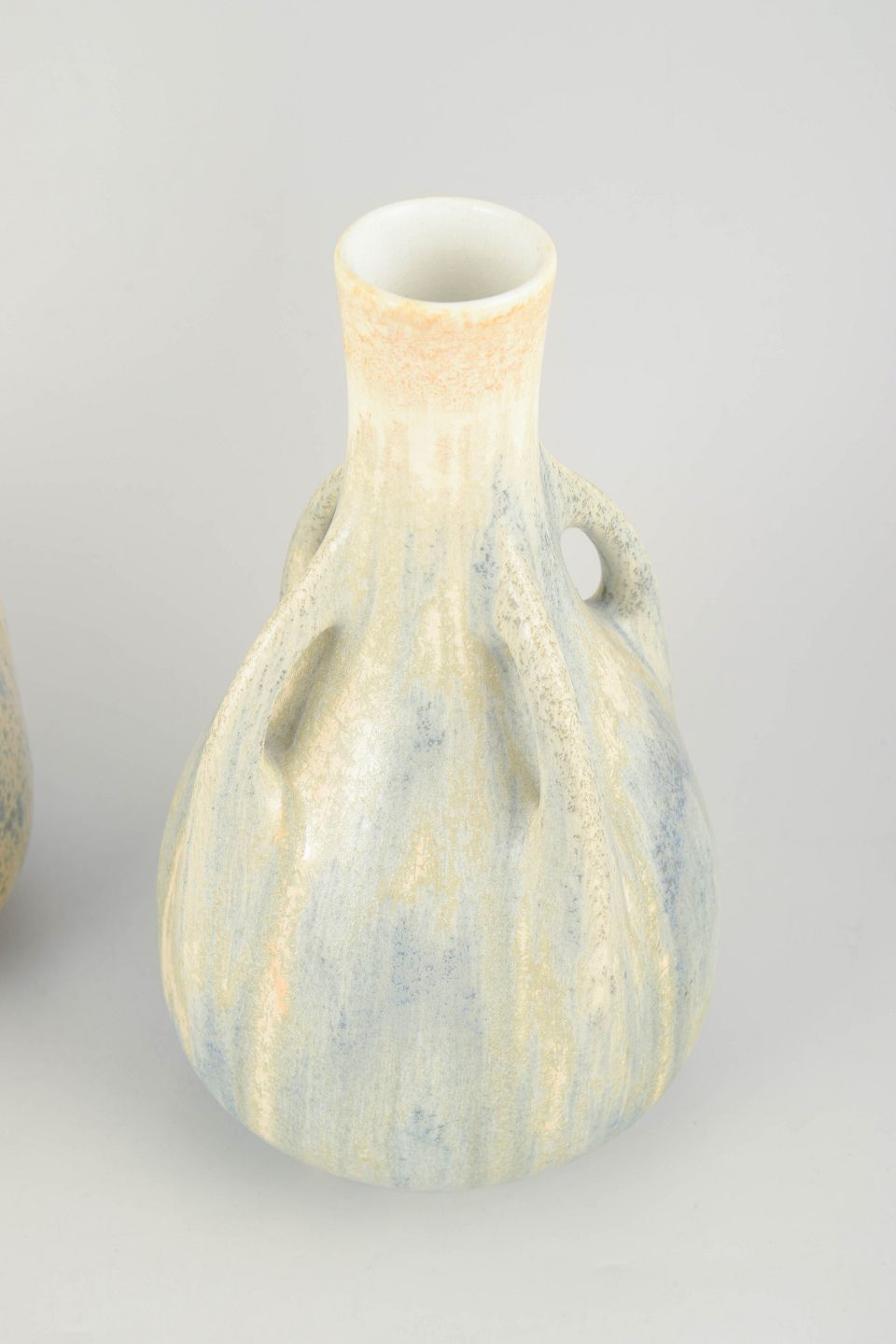 To elegante fajancevaser med balusterform og integrerede hanke ved halsen. Glasuren fremstår i bløde, nuancerede toner af elfenben, lyseblå og sandfarve med let løbende effekt, karakteristisk for tidlig 1900-tals svensk fajance.