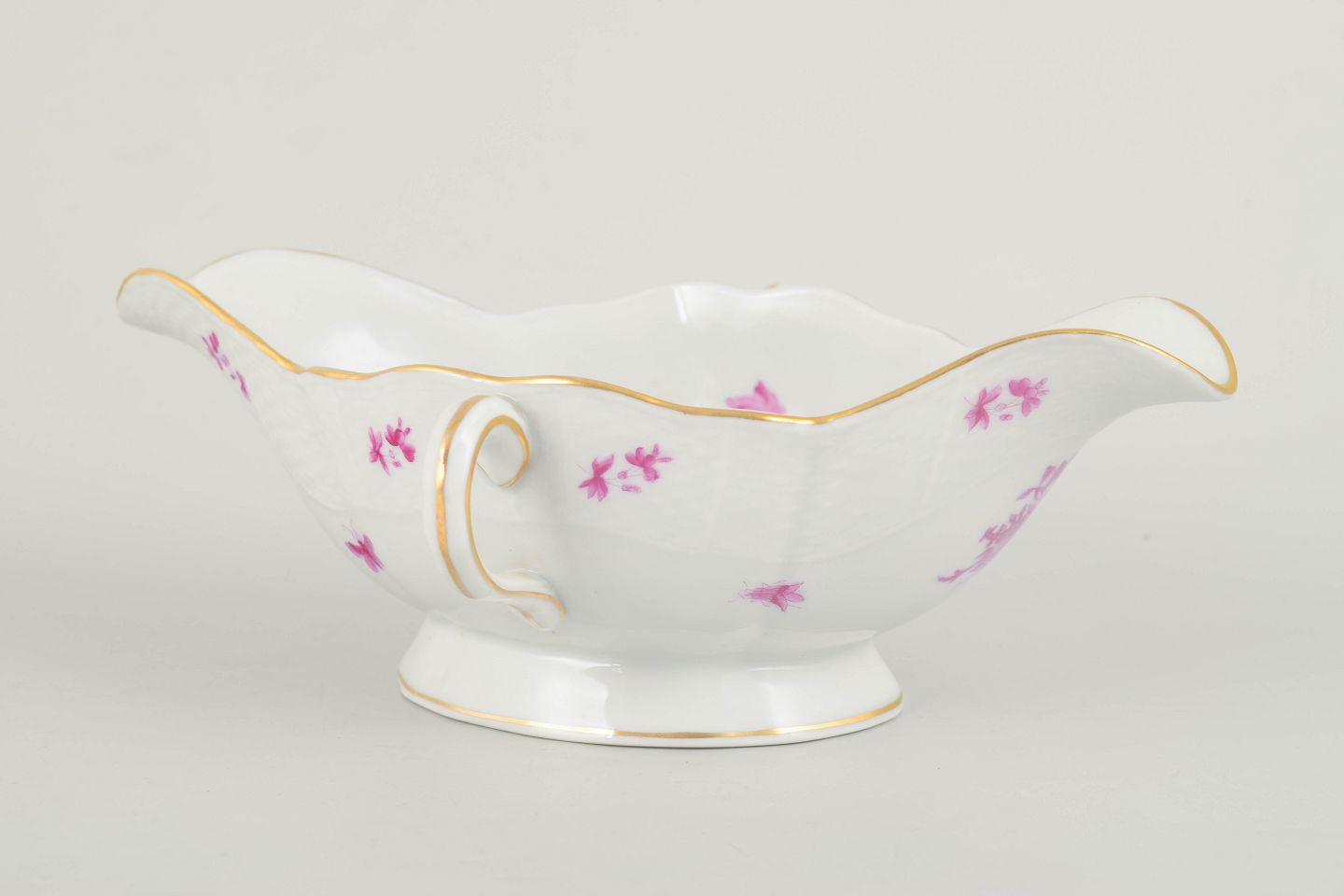 Elegant saucekande i porcelæn fra Herend dekoreret i Apponyi Pink med stiliserede blomster i rosa nuancer og fin forgyldt rand. Formen er klassisk med svungne sider og markant greb, hvilende på lav standfod. Et raffineret eksempel på fabrikkens karakteristiske dekoration og høje håndværksmæssige kvalitet fra midten af det 20. århundrede.