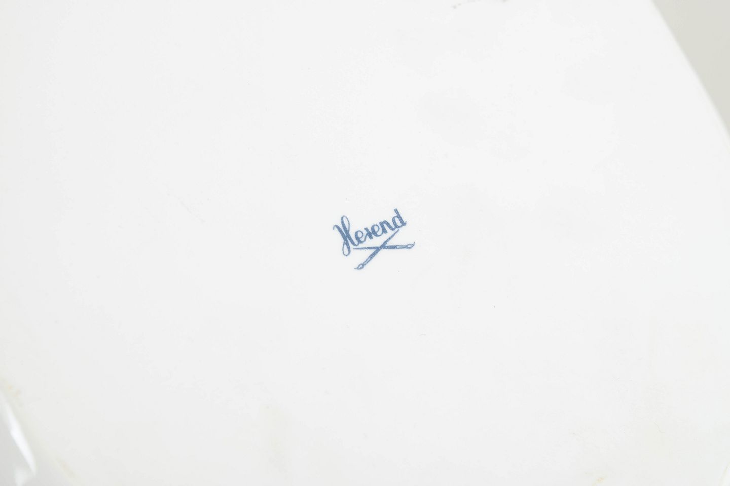 Imponerende og elegant ovalt porcelænsfad fra Herend, udført med raffineret håndmalet dekoration og fin forgyldning langs randen. Fadet fremstår med klassisk proportionering og balanceret form, typisk for fabrikkens produktion i mellemkrigstiden. Et repræsentativt og dekorativt serveringsfad fra 1930’erne.