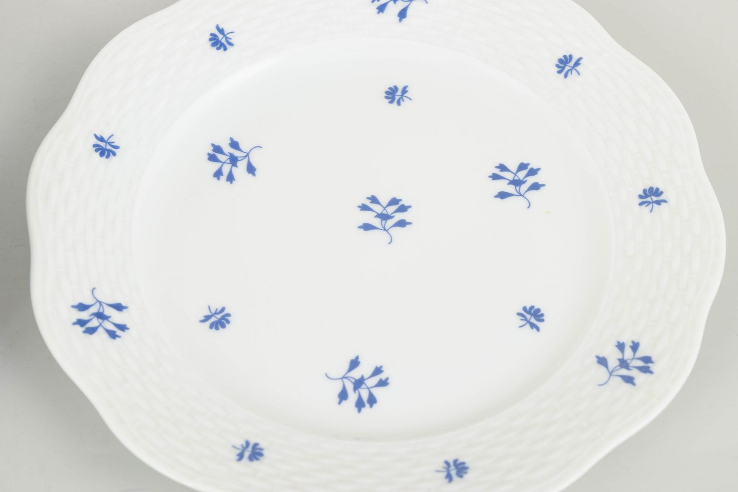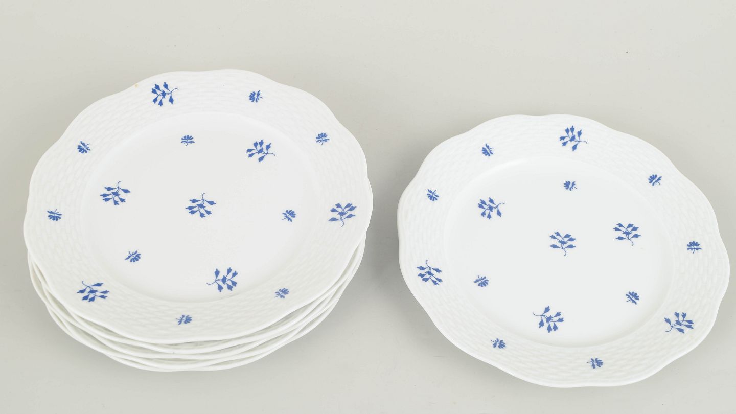 Elegant sæt af seks håndmalede porcelænstallerkener fra Herend med diskret blå blomstermotiv fordelt over fanen og midterfeltet. Den let bølgede rand og fine reliefstruktur giver en klassisk og raffineret fremtoning, karakteristisk for fabrikkens mellemkrigsproduktion. Et harmonisk og dekorativt stel i mindre format.