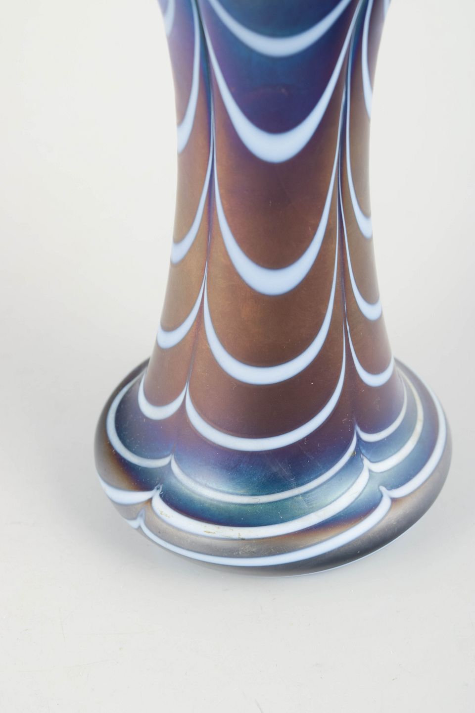 Større vase i mundblæst glas med rundet korpus og bred, let udadbøjet rand. Overfladen fremstår med silkemat iriserende finish i gyldne, blålige og let violette nuancer, som skifter afhængigt af lyset. Den harmoniske, balancerede form kombineret med det metalliske farvespil er karakteristisk for Loetz’ produktion i 1920’erne, hvor enkle klassiske former blev forenet med raffinerede overfladeeffekter.