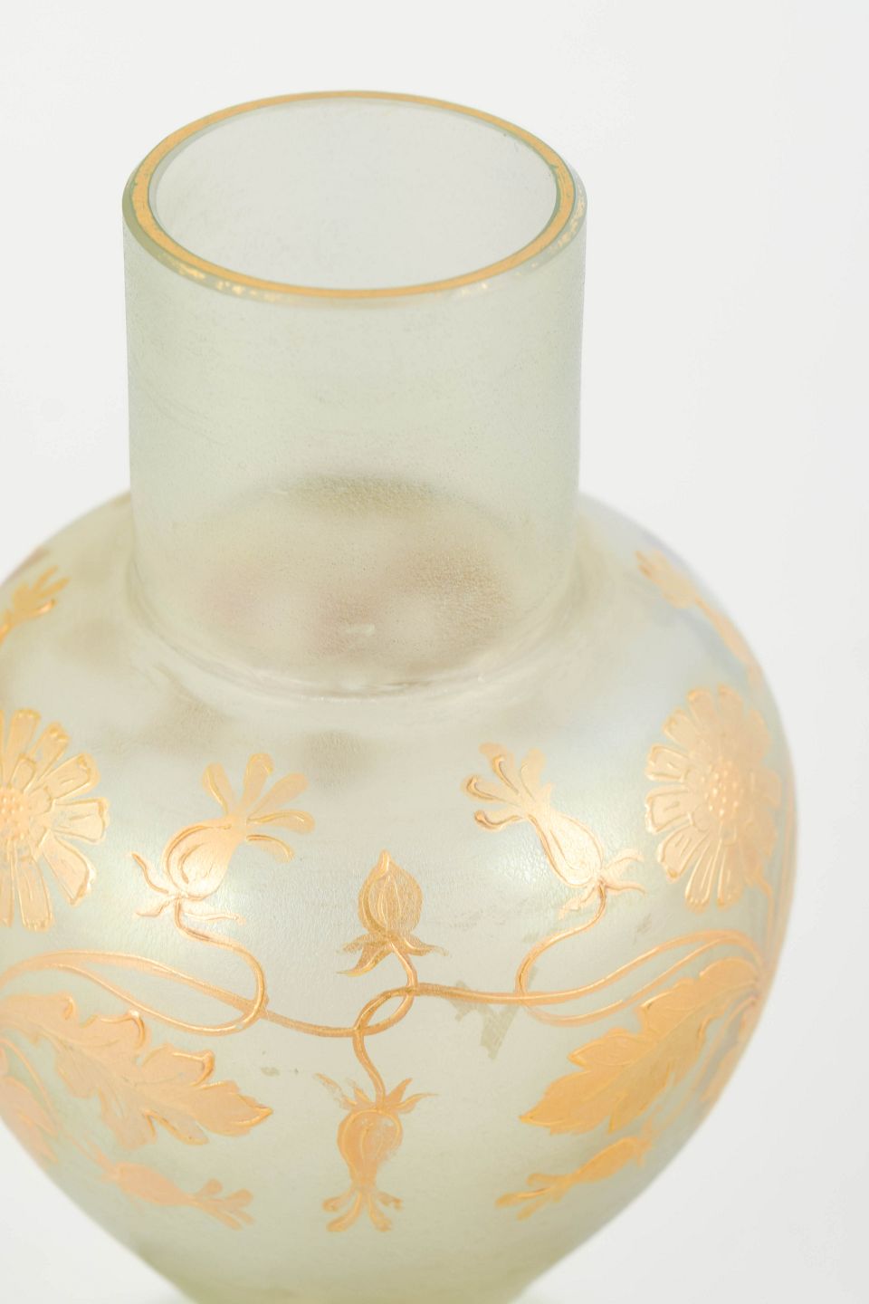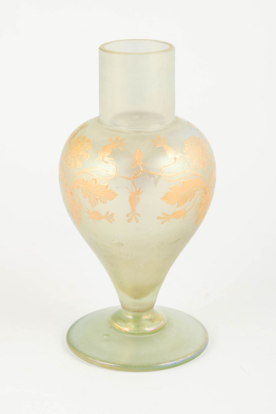 Dekorativ vase i mundblæst glas med mat, let opaliserende overflade i grønlig tone og iriserende, floralt slyngende dekoration i gyldne og rosa nuancer. Den balusterformede krop med cylindrisk hals og rund fod er karakteristisk for Loetz’ produktion i mellemkrigstiden, hvor klassiske former blev kombineret med raffinerede overfladeeffekter.