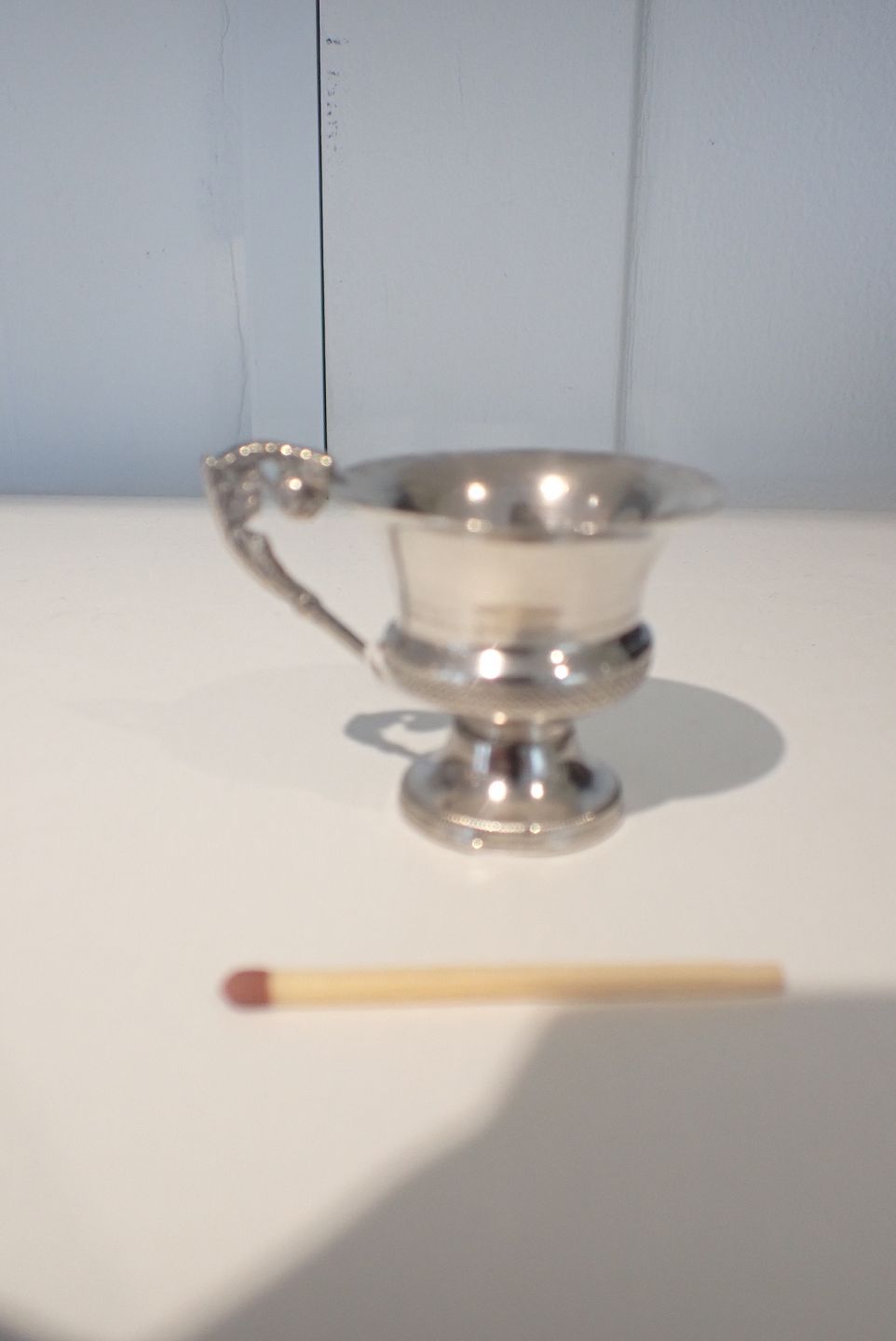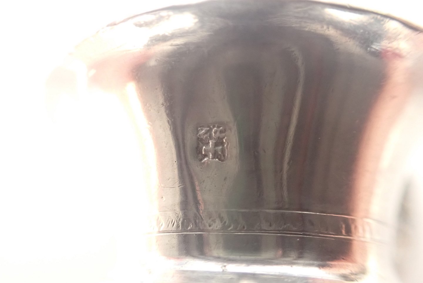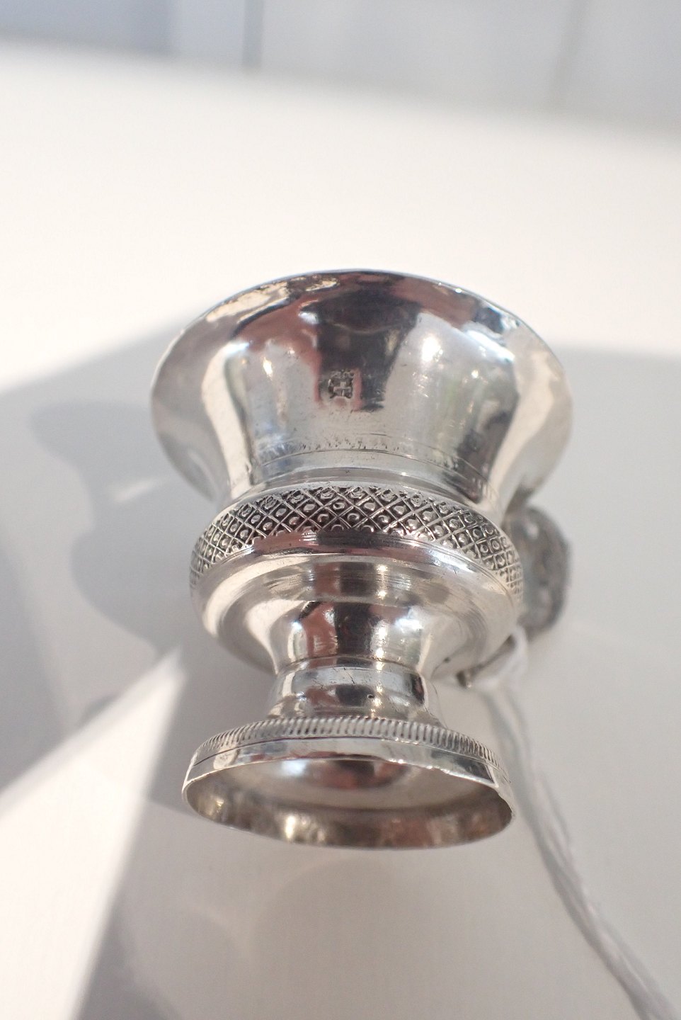 Text zugänglich auf Dänische: Russisk miniature vodka kop i sølv med mønsterdekoration 1800-tallet. Stempel ukendt 8,z ? og et kors. Højde: 4 cm. Diameter kop foroven u hank: 4,2 cm. Med hank: 5,5. I fin stand med tidstypisk slid. Vægt: 16,6 gram.
