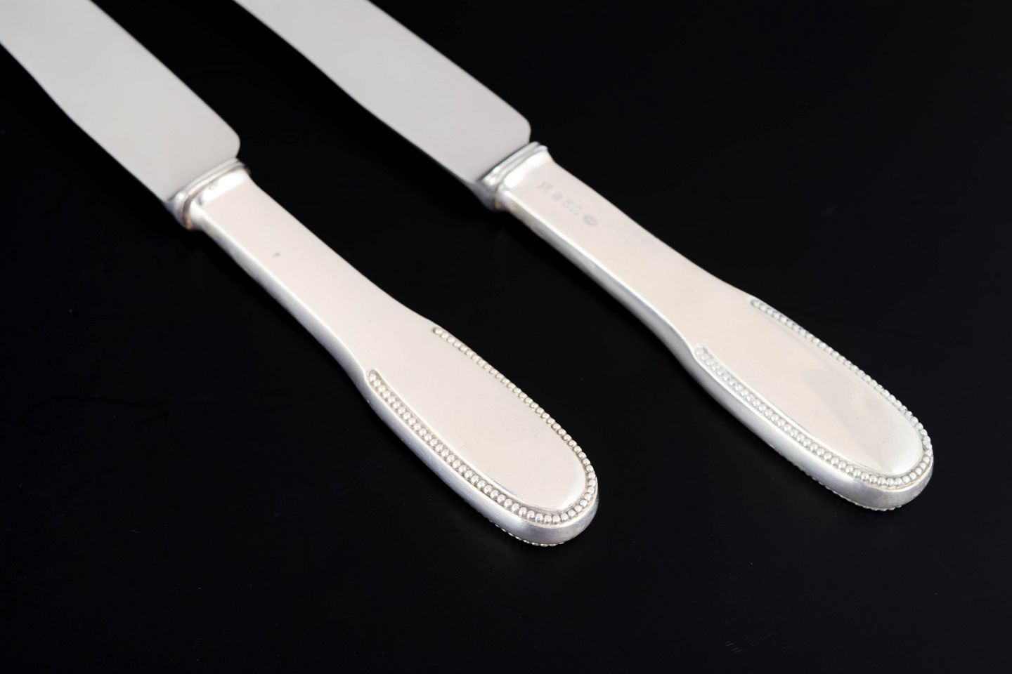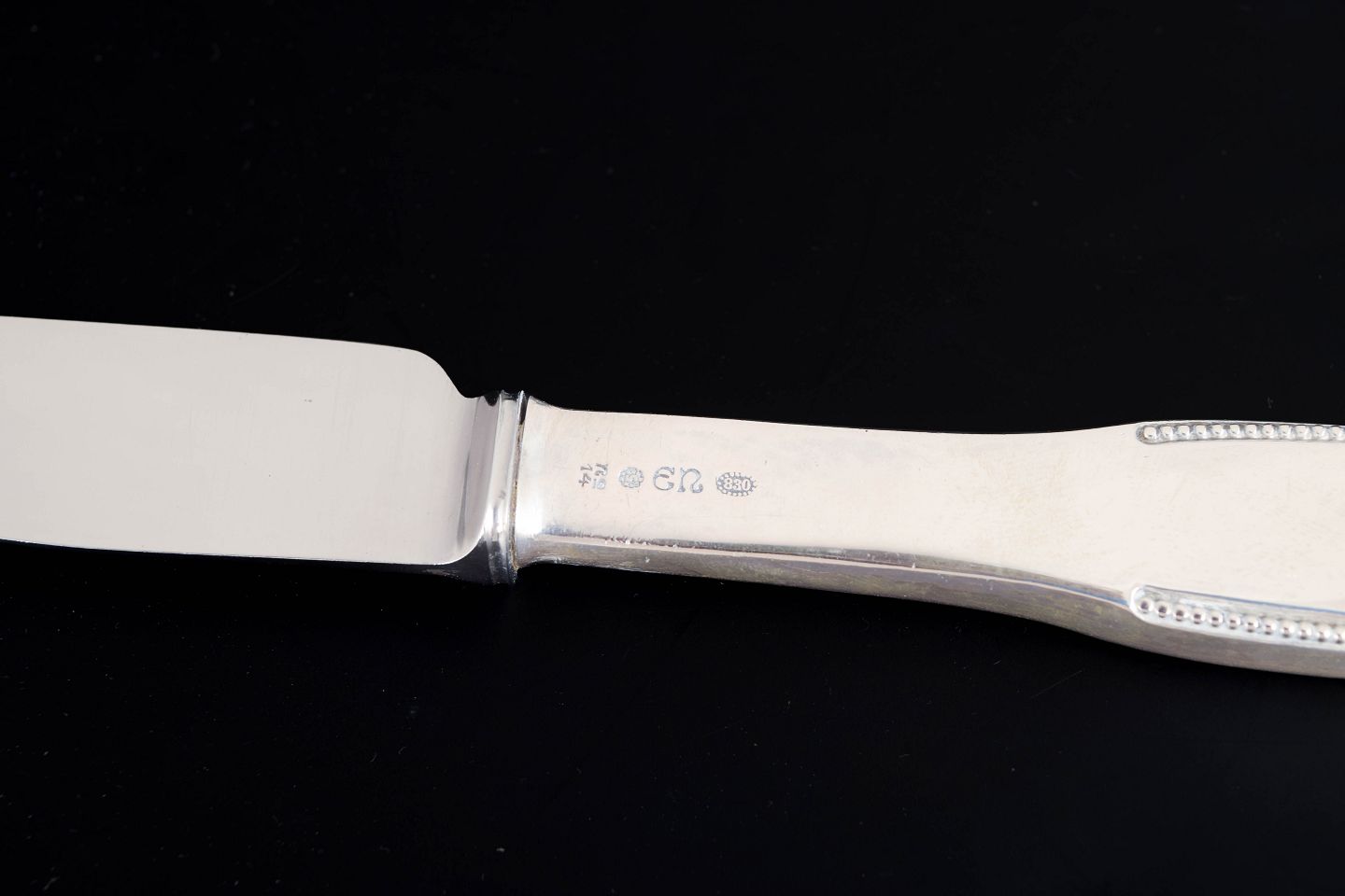 Elegante middagsknive i tretårnet sølv og rustfrit stål. Model nummer 14 med klassisk, let afrundet skaftform med diskret perlekant og glat klinge med skær. Fremstillet hos Evald Nielsen, længde 23,5 cm.