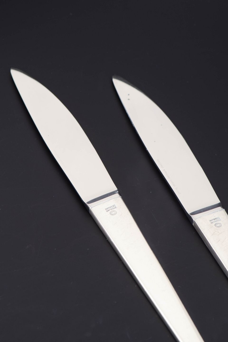 To frokostknive i rustfrit stål og sterlingsølv i modellen Caravel, designet af Henning Koppel for Georg Jensen. Bestikket er udført i et stramt og elegant formsprog med slanke linjer og let konisk form, karakteristisk for Koppels modernistiske design.