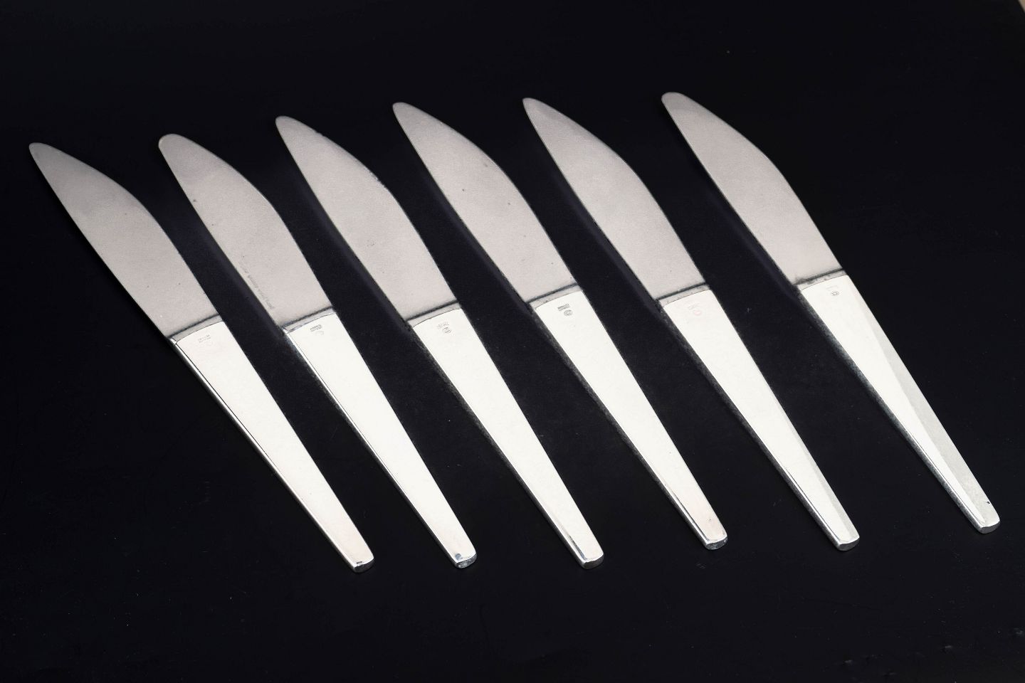 Sæt af seks middagsknive i rustfrit stål og sterlingsølv i modellen Caravel, designet af Henning Koppel for Georg Jensen. Bestikket er udført i et rent og moderne formsprog med slanke linjer og let konisk form, karakteristisk for Koppels funktionalistiske design.