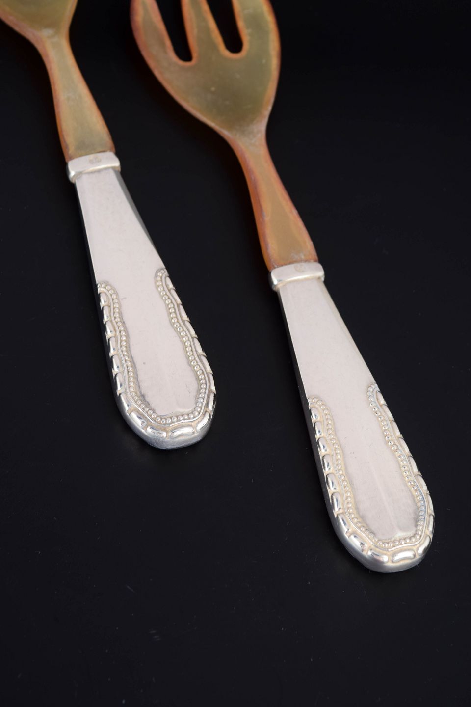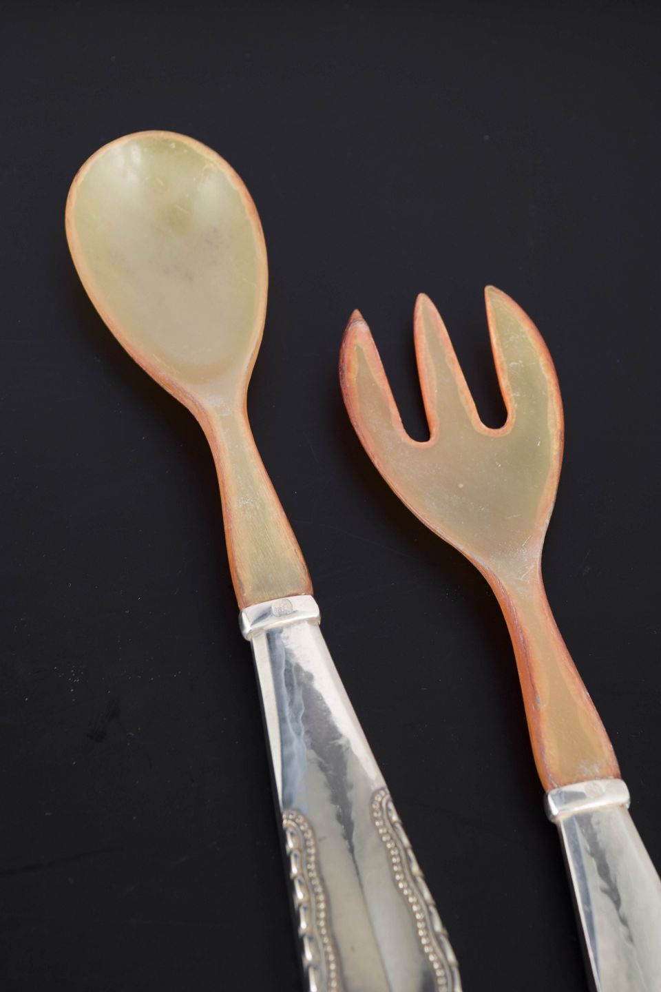 Elegant salatsæt i 830 sølv og ben med skaft i mønstret Nordisk. Sættet består af ske og gaffel med bløde, afrundede former. Fremstillet hos Georg Jensen i perioden 1915–1930 og mærket med tretårnet sølvstempel.