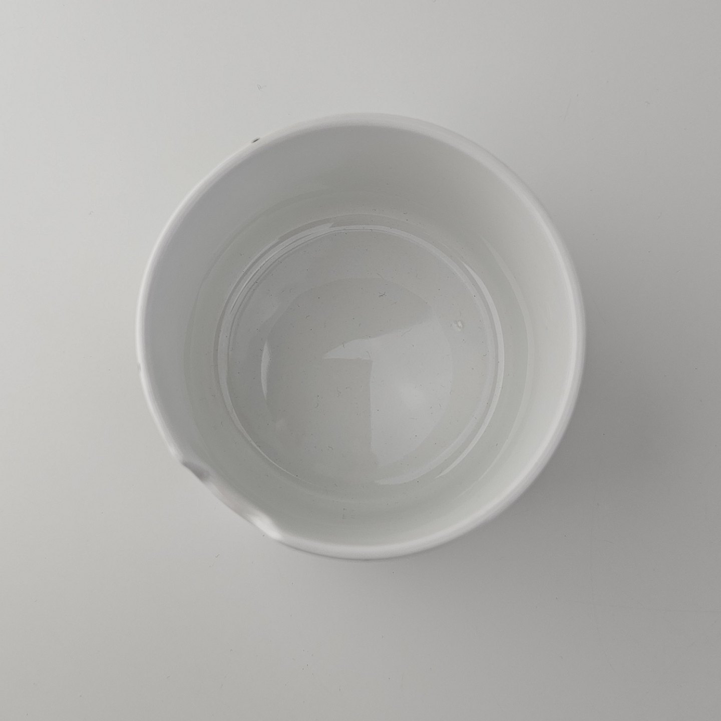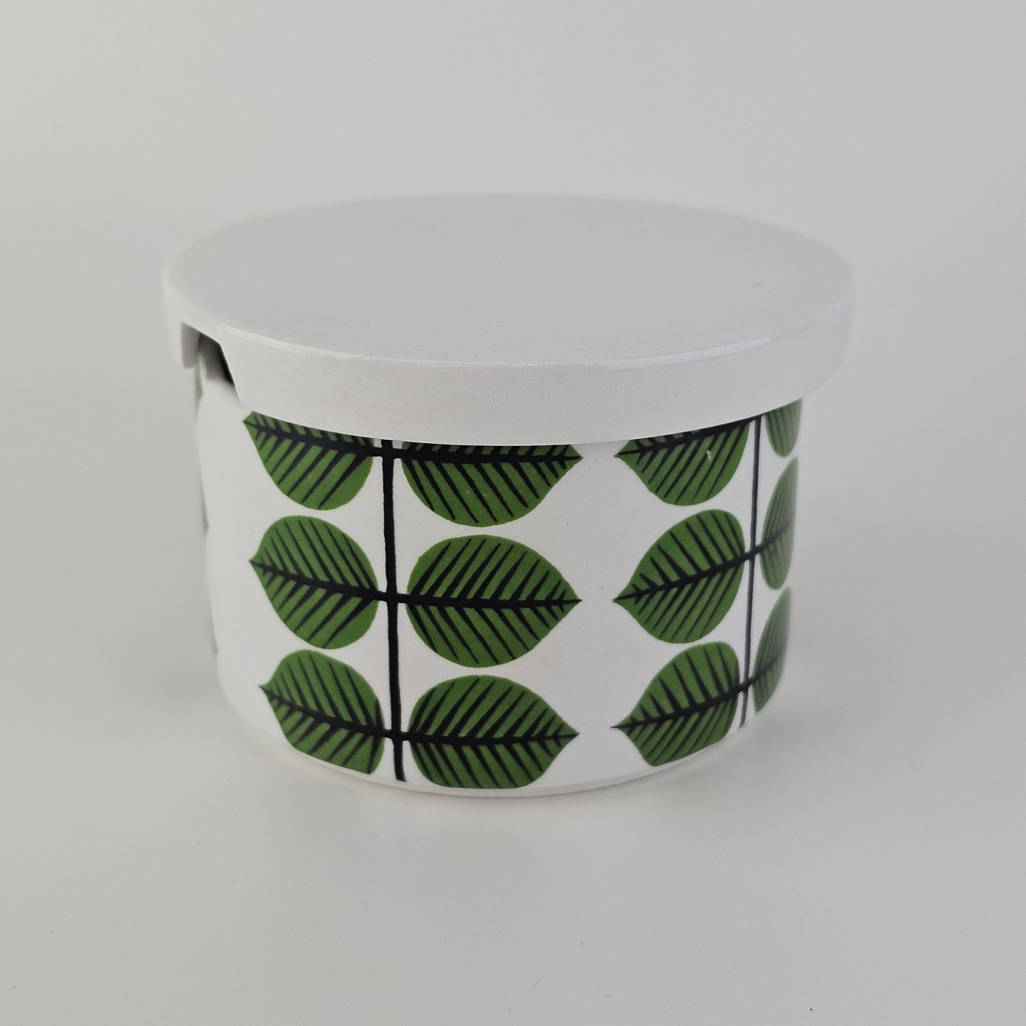Stel i hvidt porcelæn med dekoration af grønne blade.