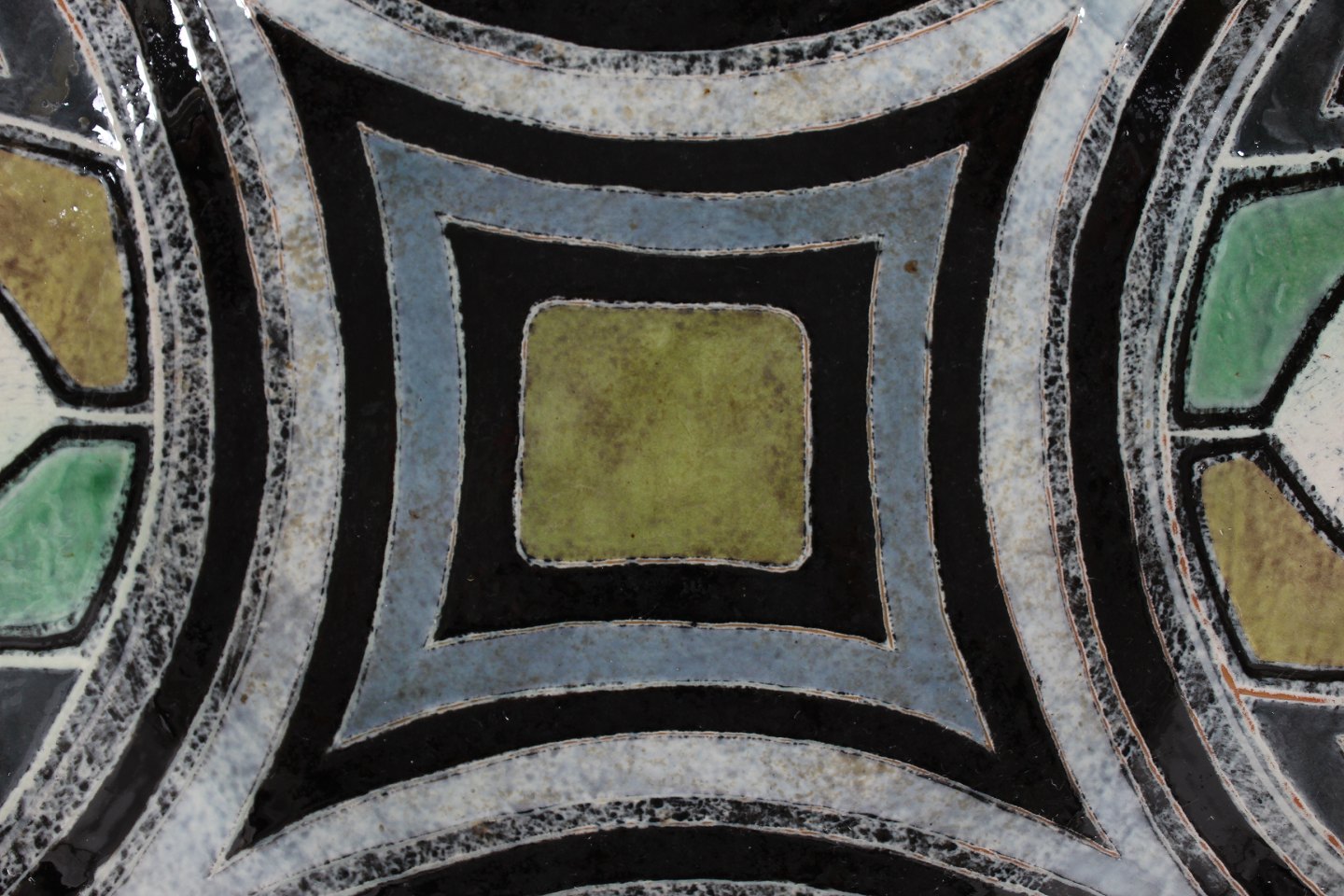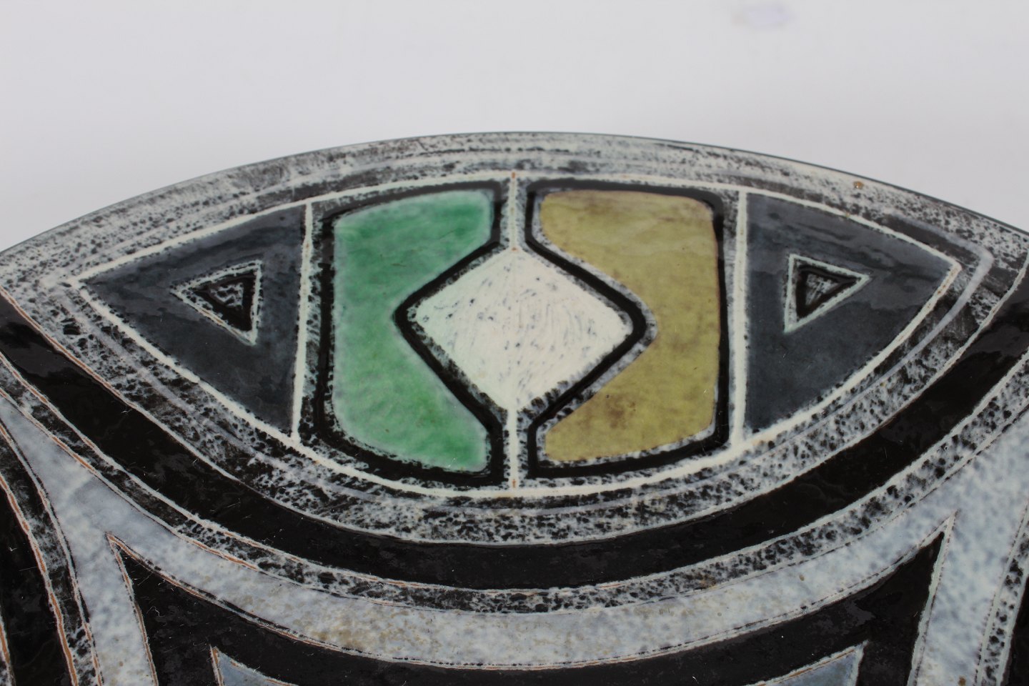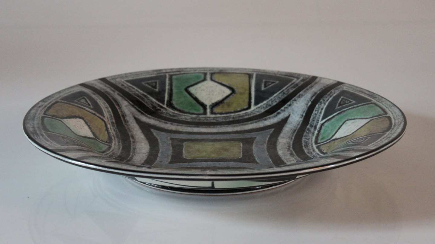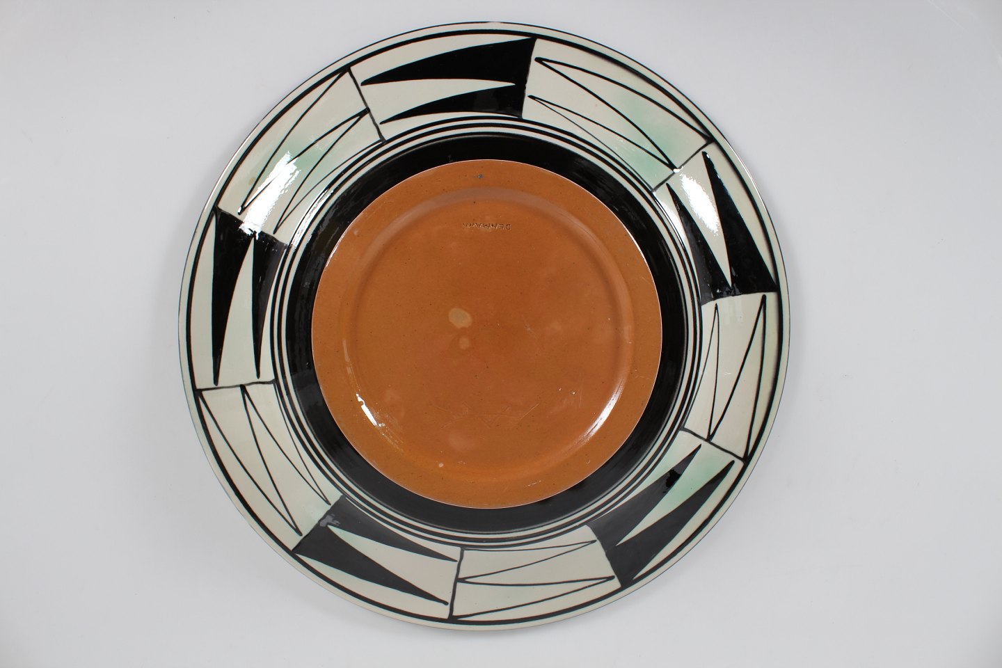 Stort cirkulært keramik fad med grafisk mønster