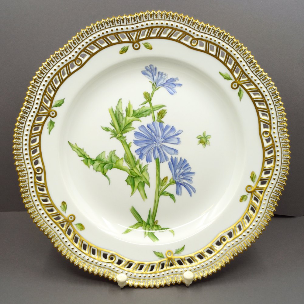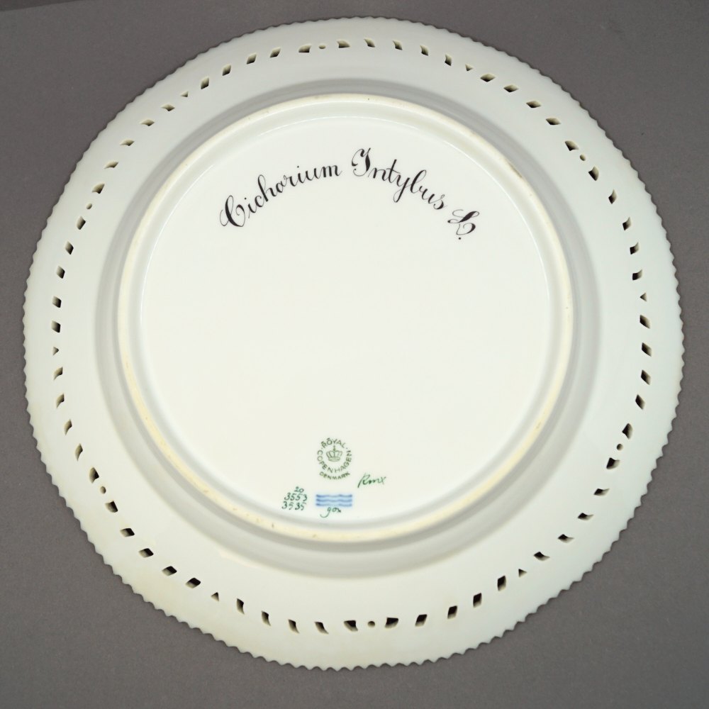 Text zugänglich auf Dänische: Royal Copenhagen, Flora Danica porcelæn; Middagstallerken #3553/3535 med gennembrudt kant.