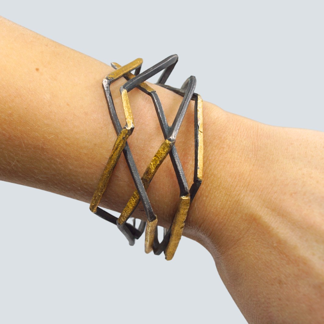 Text zugänglich auf Dänische: Anette Kræn; Bred armring i oxideret sølv, delvist forgyldt.