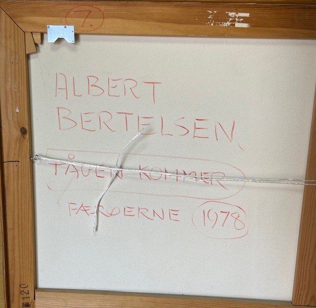 Text zugänglich auf Dänische: "Tågen kommer" Færøerne. Et af kunstnerens bedste oliemalerier fra Færøerne. Maleriet har været udstillet på Vejle Kunstmuseum.