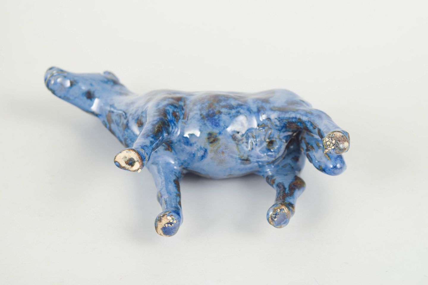 Unik keramisk figur forestillende et føl udført i stentøj med blank glasur i blå toner med brunlige nuancer. Figuren er modelleret med en naturlig kropsholdning og detaljeret manke og hoved, hvilket giver et levende og karakterfuldt udtryk. Usigneret unika fra 1970’erne.