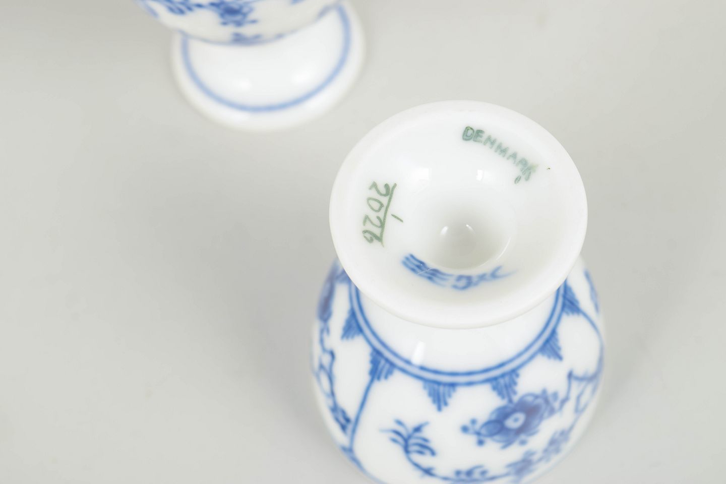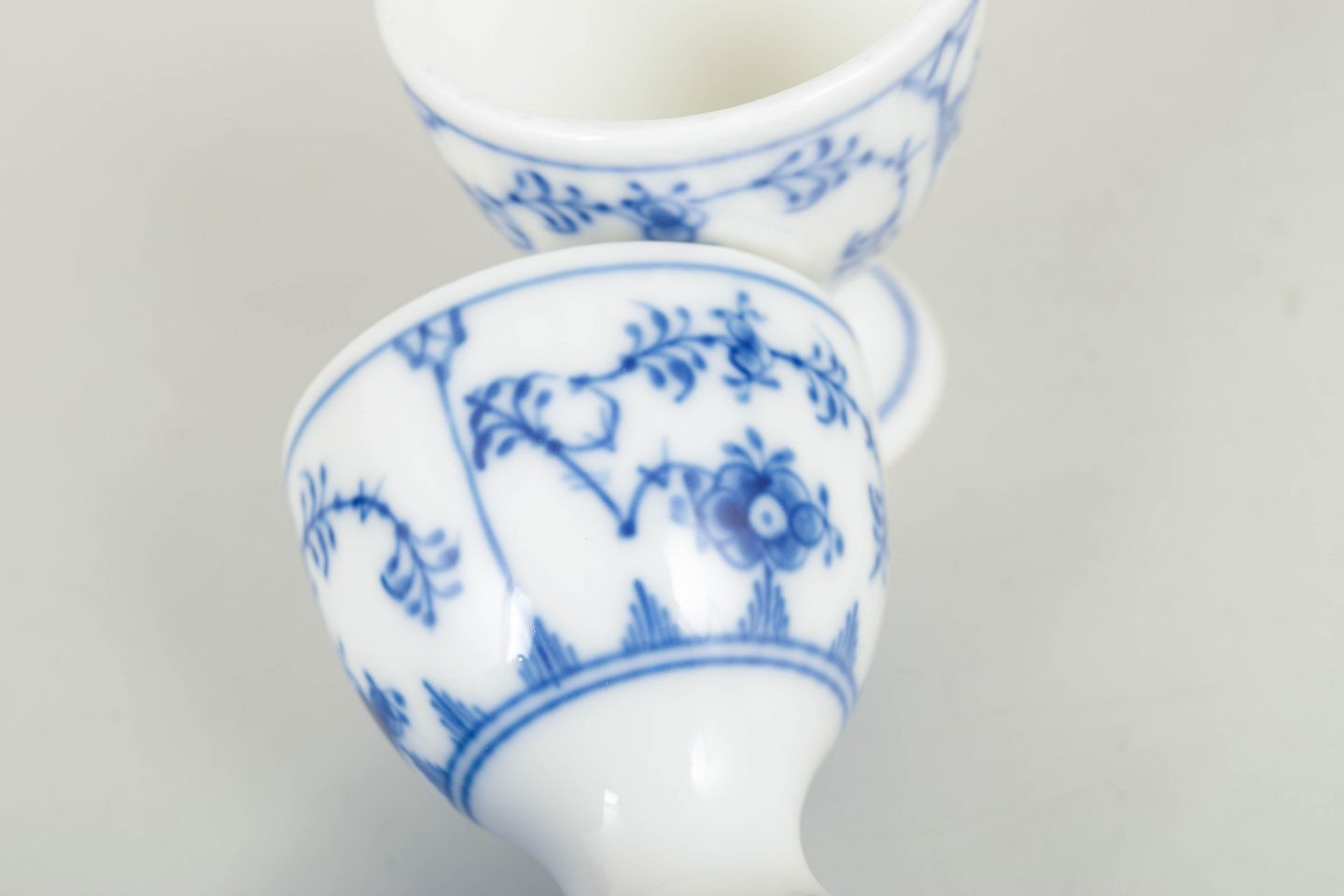 Sæt af to håndmalede æggebægre i porcelæn dekoreret med det klassiske musselmalede riflet mønster i blå underglasur. Æggebægrene har rund skålformet overdel og lille fod, dekoreret med de karakteristiske blomsterornamenter og slyngede blomstergrene fra serien. Undersiden er fabriksstemplet Royal Copenhagen, første og anden sortering. Model 1/2026.