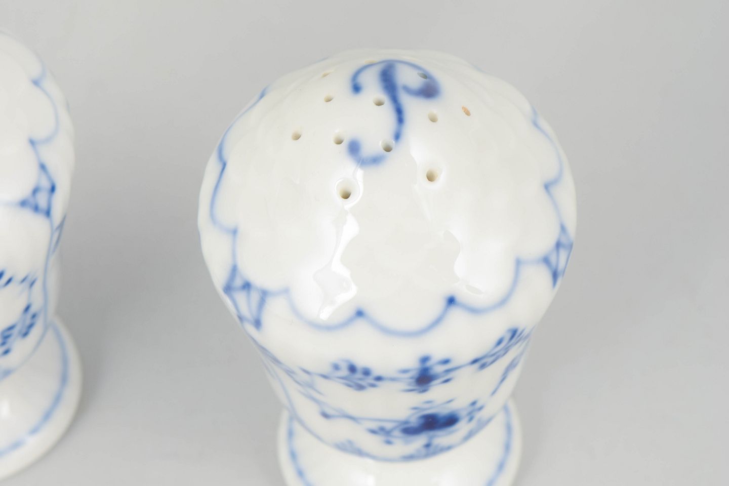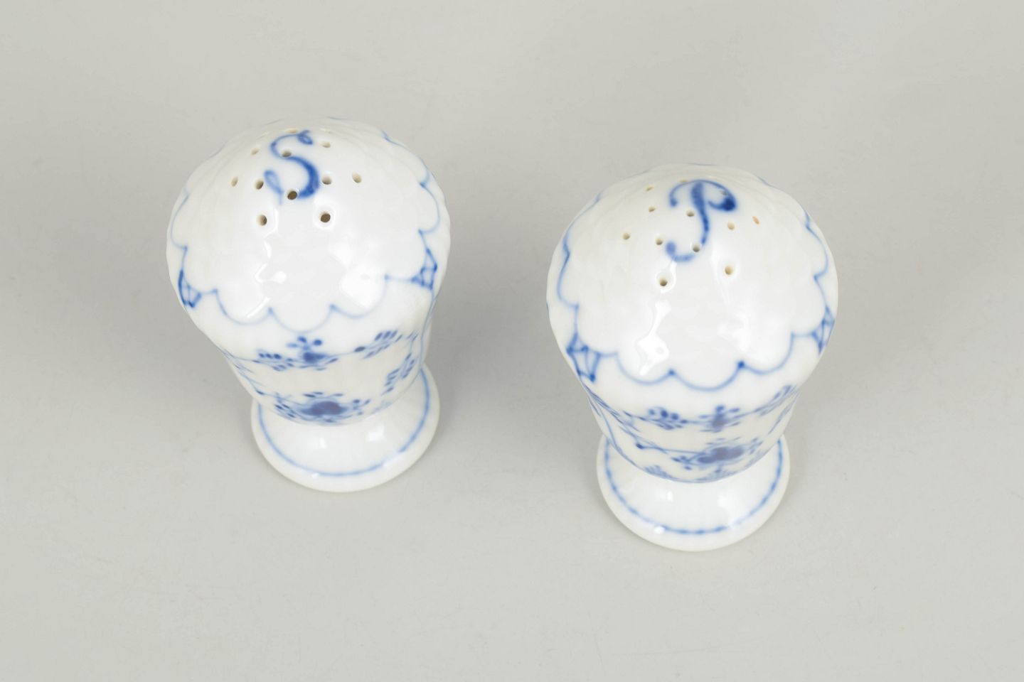 Håndmalet salt- og pebersæt i porcelæn dekoreret med det klassiske musselmalede riflet mønster i blå underglasur. Begge dele er udført i en elegant balusterform med lille fod og afrundet top med huller. Undersiden er fabriksstemplet Royal Copenhagen, første sortering. Model 1/467 og 1/480.