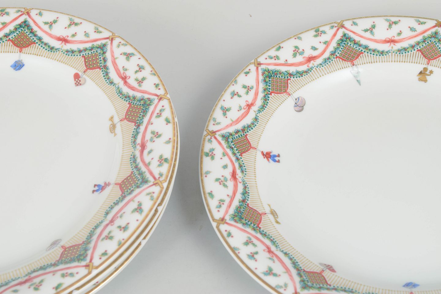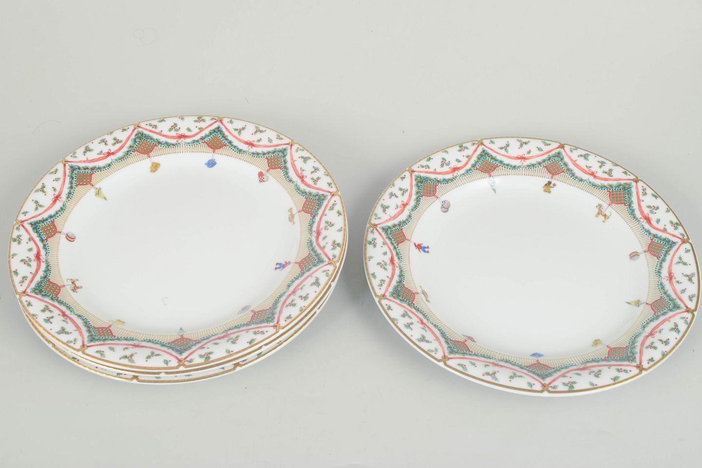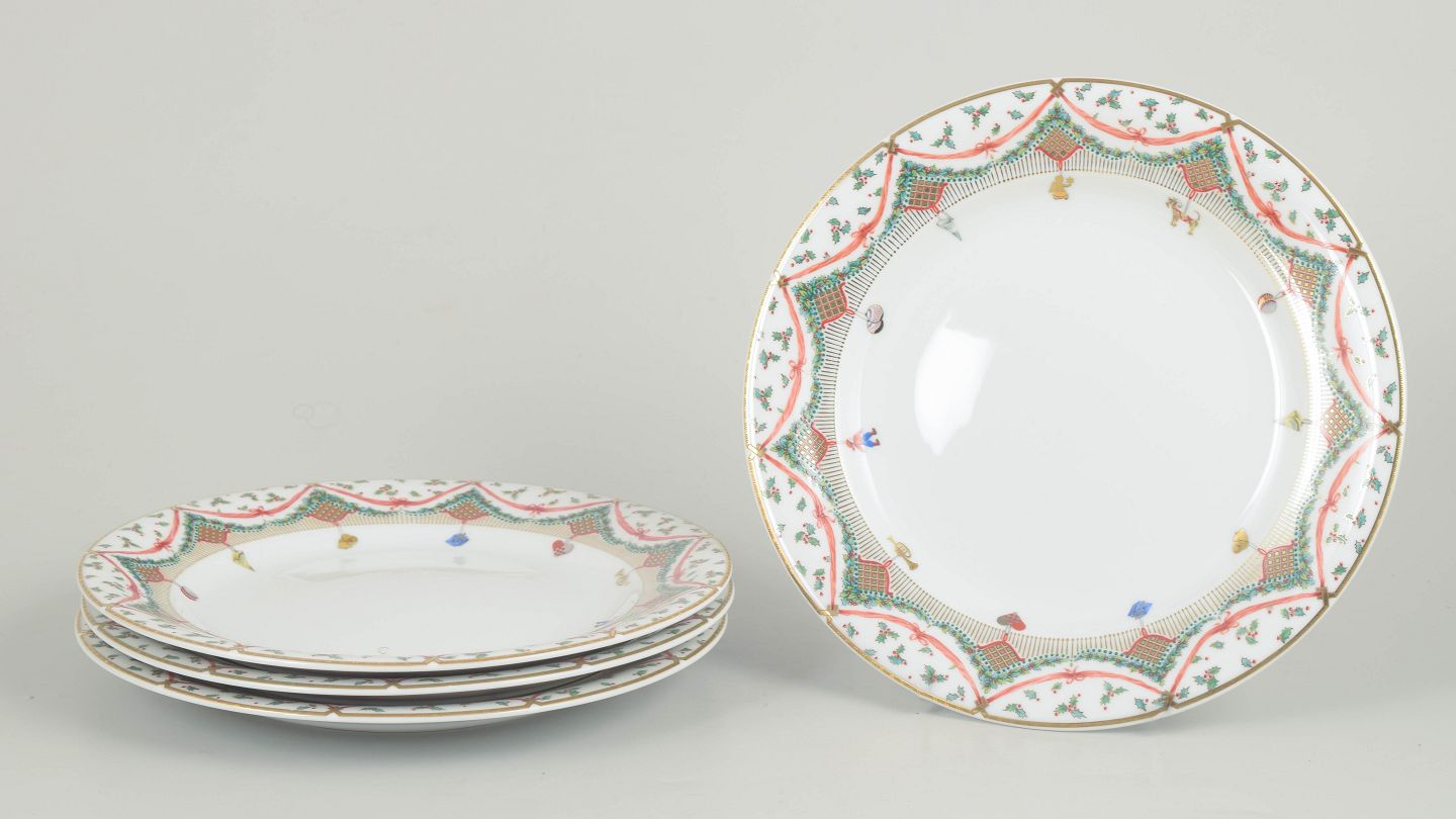 Sæt med fire porcelænstallerkener fra Royal Copenhagen i dekorationen Christmas Joy, model 622. Tallerkenerne er dekoreret med en farverig bordure med guirlander, stjerner og små ornamentale detaljer i grønne og røde toner omkring en hvid midte. Serien blev produceret i slutningen af det 20. århundrede og er udført i klassisk Royal Copenhagen porcelæn med fin glasur og præcis dekoration.