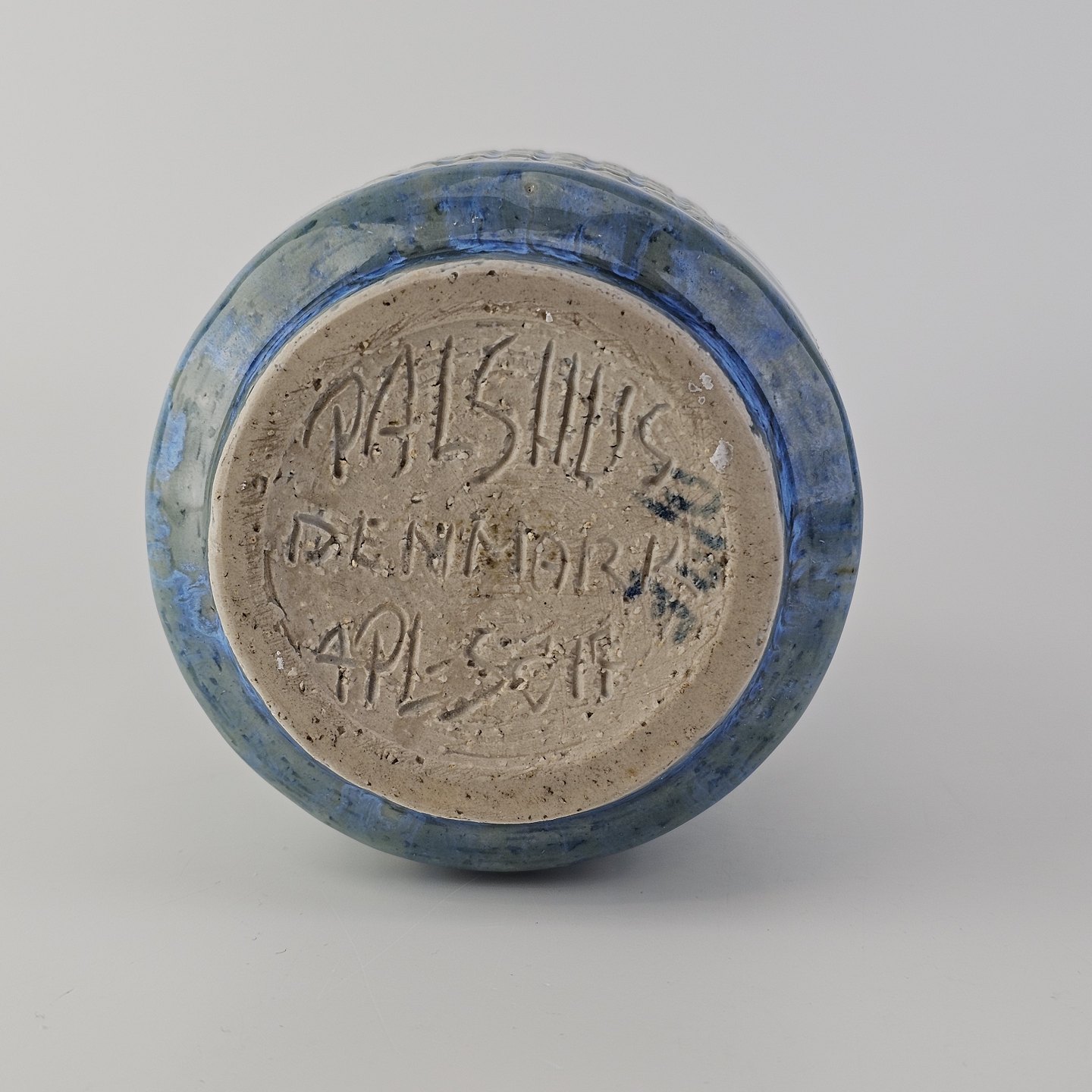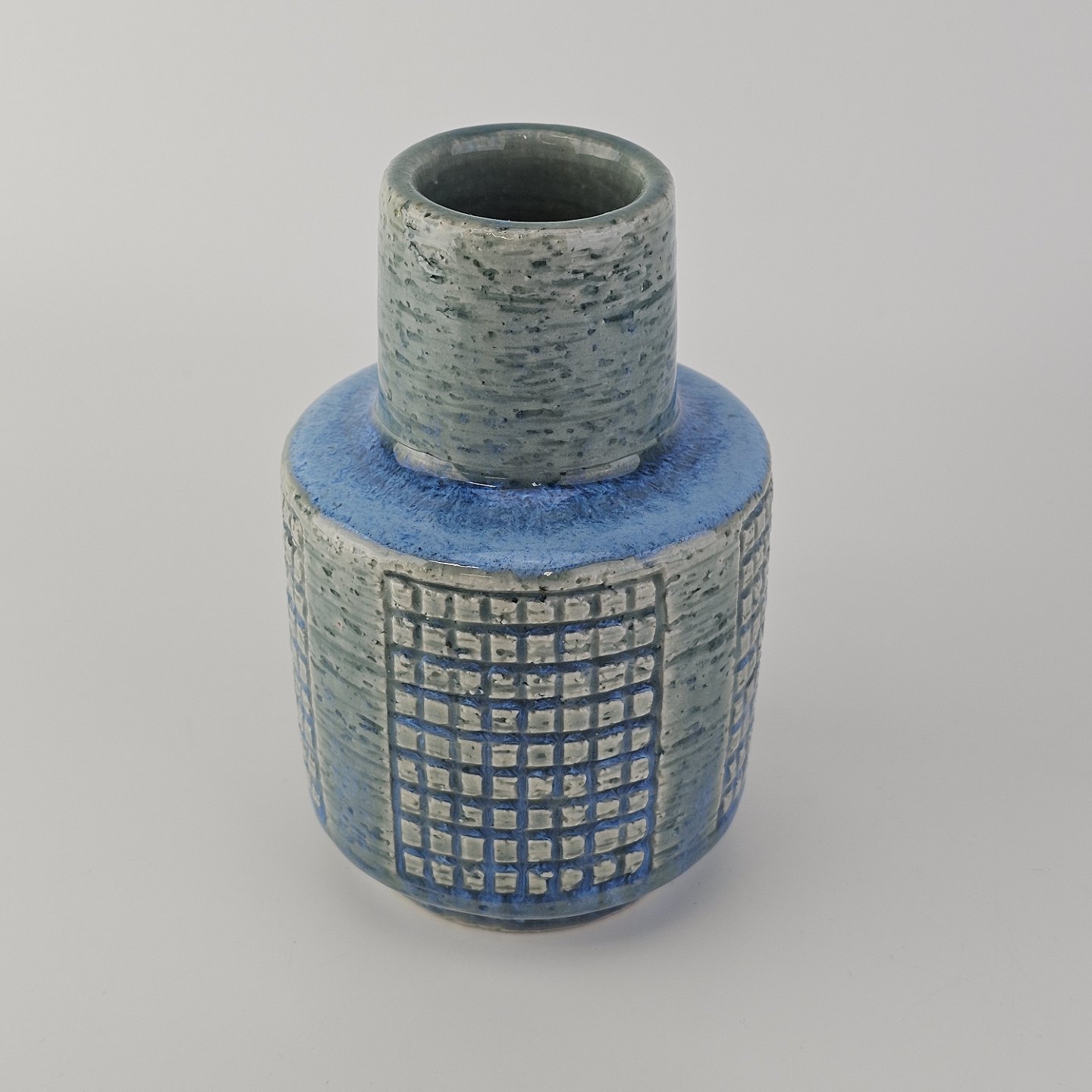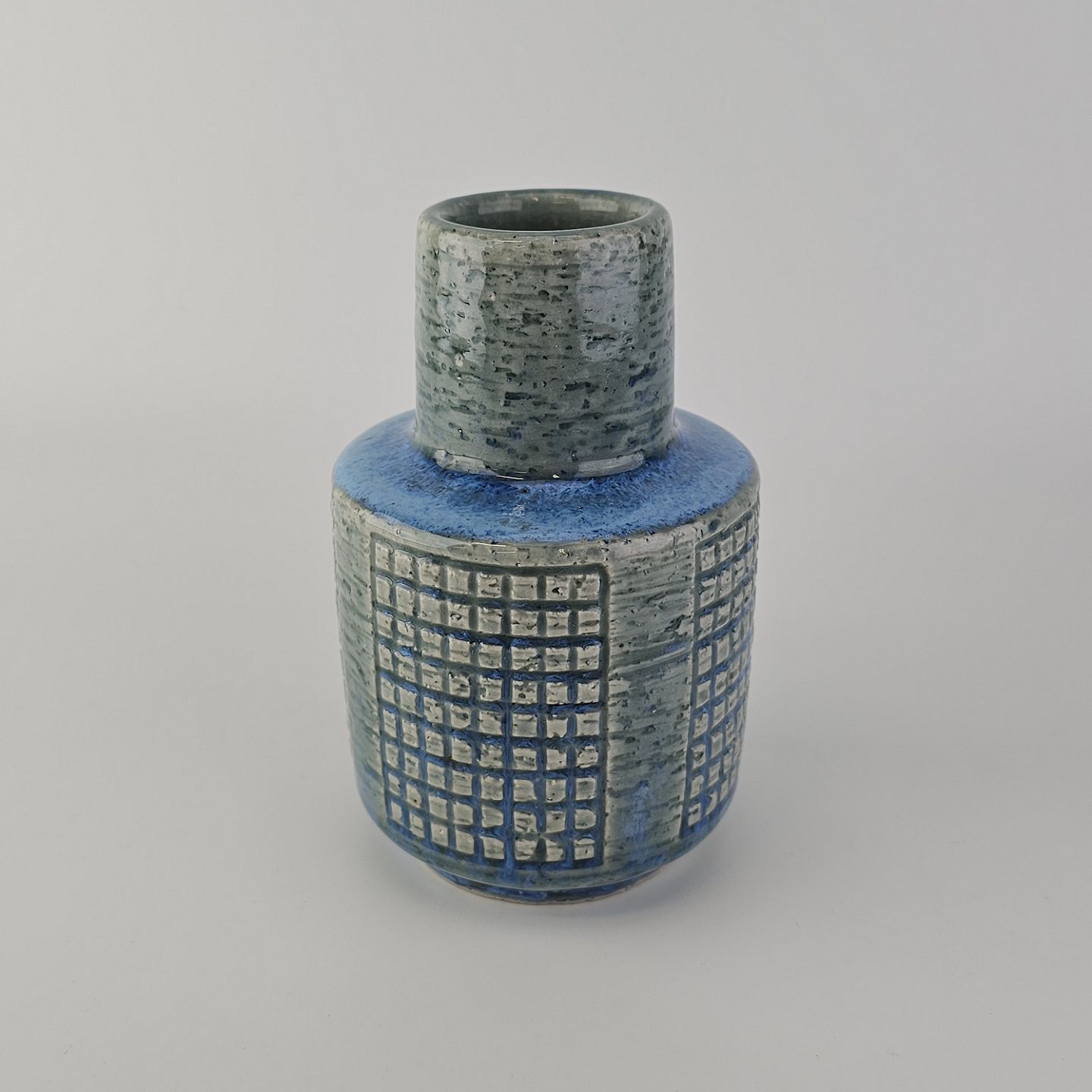 Rund vase i blåt glaseret stentøj med geometrisk mønster
