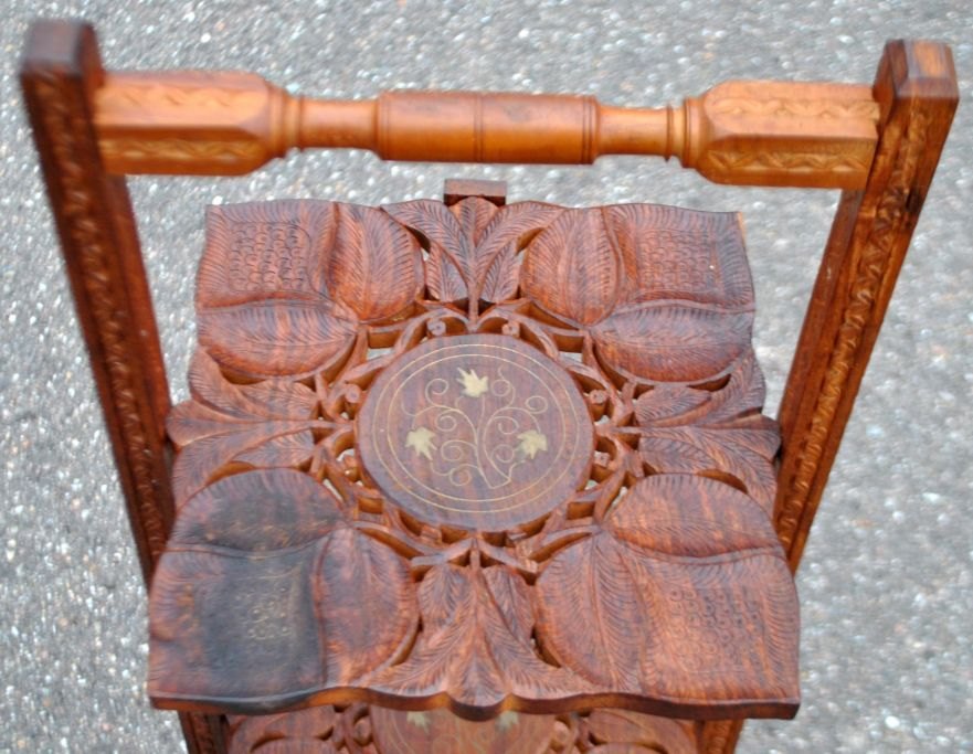 Tortenständer aus Teakholz, 19. Jahrhundert. Indien. Dreistöckig mit Schnitzereien von Blumen und Blättern. Mit Messingeinlagen in Blumenform. Höhe: 80,5 cm. Breite: 27,5 cm. Tiefe: 24 cm.