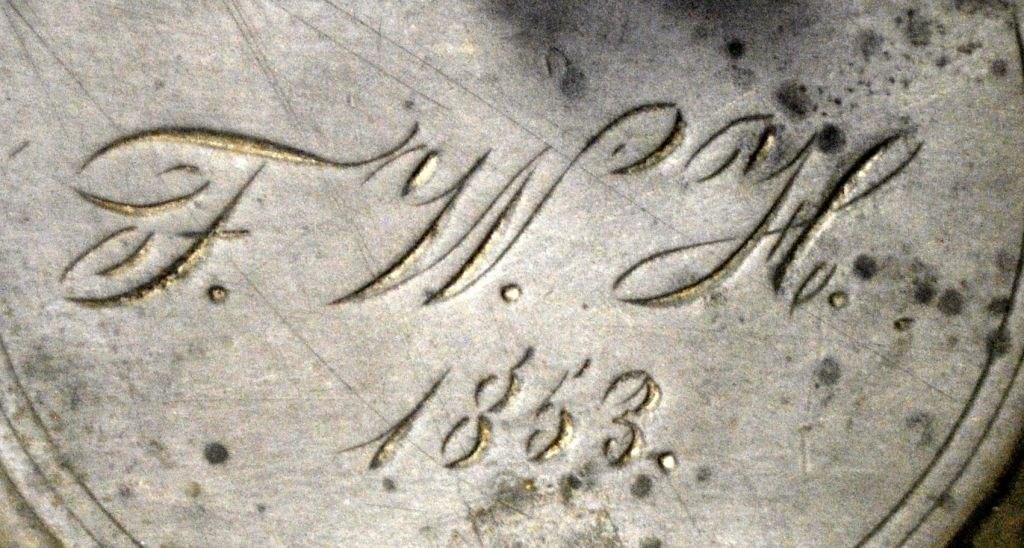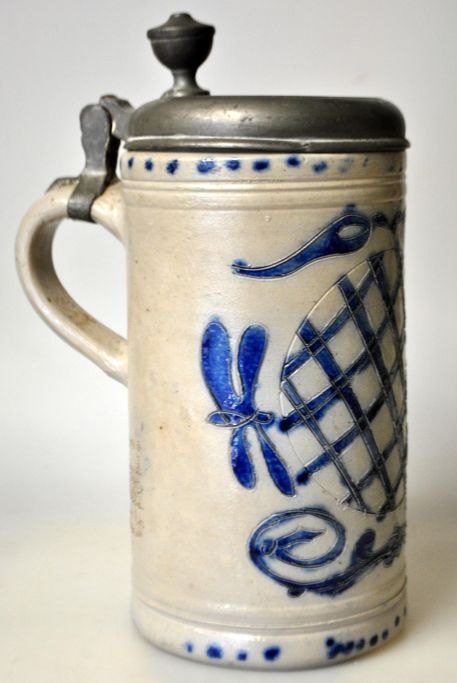Deutscher Westenwälder Krug, 1853, Steinzeug, graue Salzglasur. Mit manganvioletten Verzierungen. Mit Zinndeckel und -ausguss. Graviert: FWH 1853. Höhe: 23 cm.