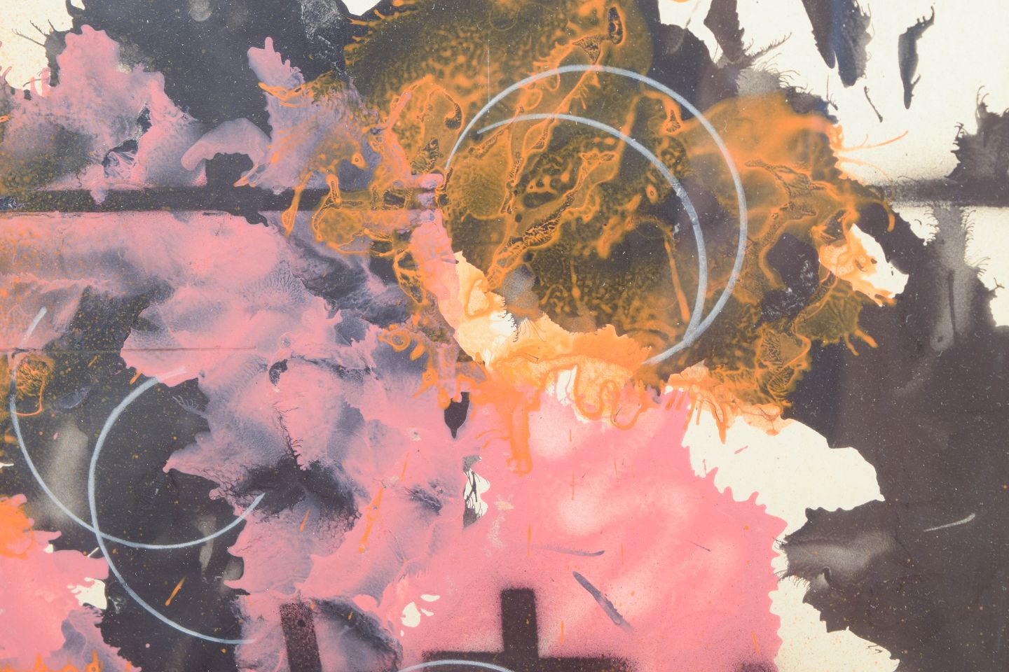 Abstrakt komposition udført i akvarel på papir med ekspressive farvefelter i rosa, orange, sorte og violette toner kombineret med grafiske linjer og cirkulære former. Kompositionen har en spontan og dynamisk opbygning med lagdelte strukturer og kontraster mellem transparente og mørkere farvefelter.