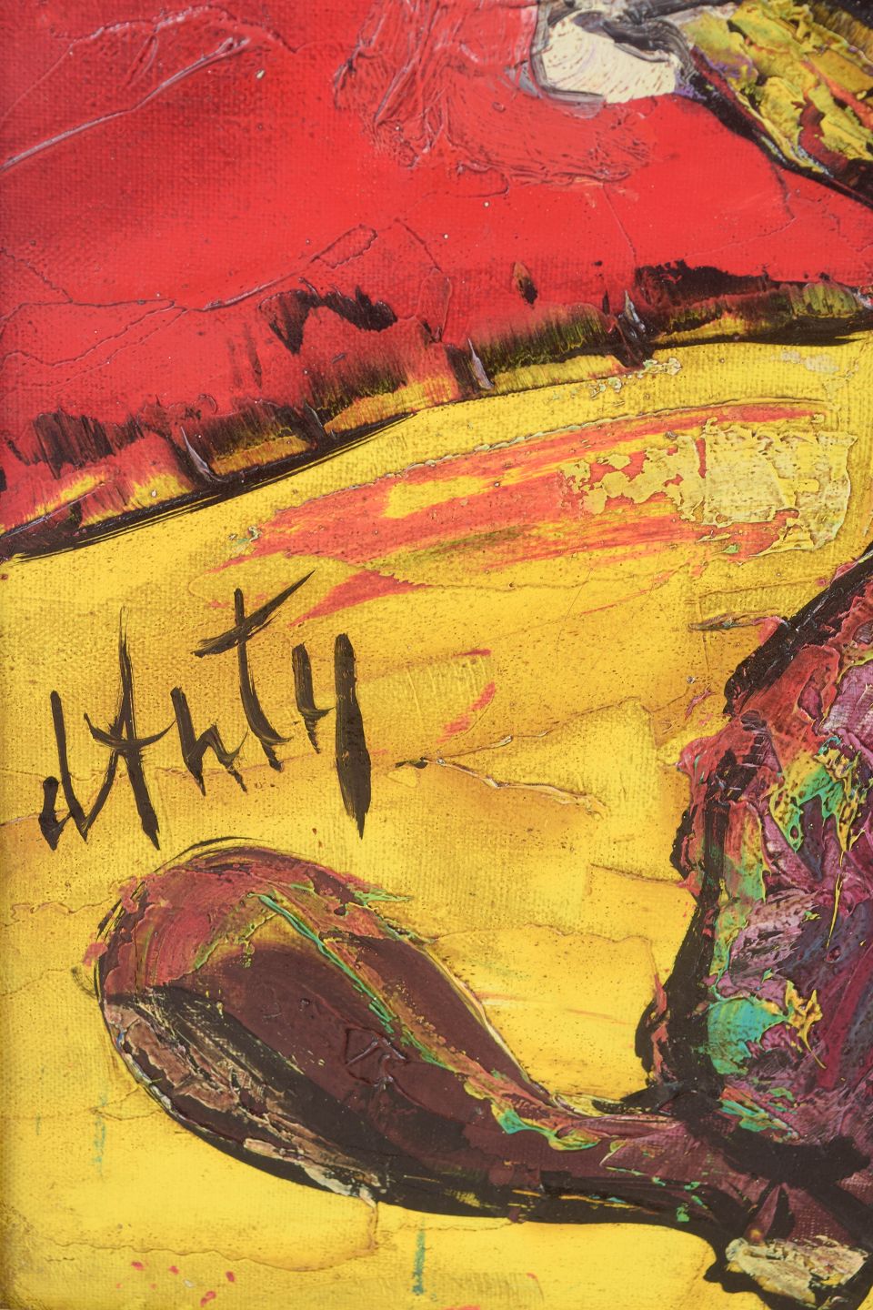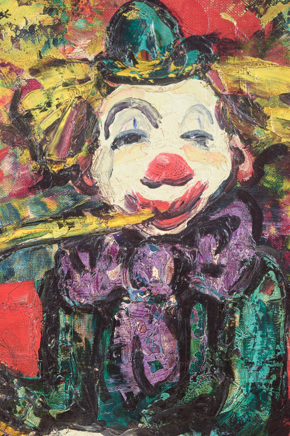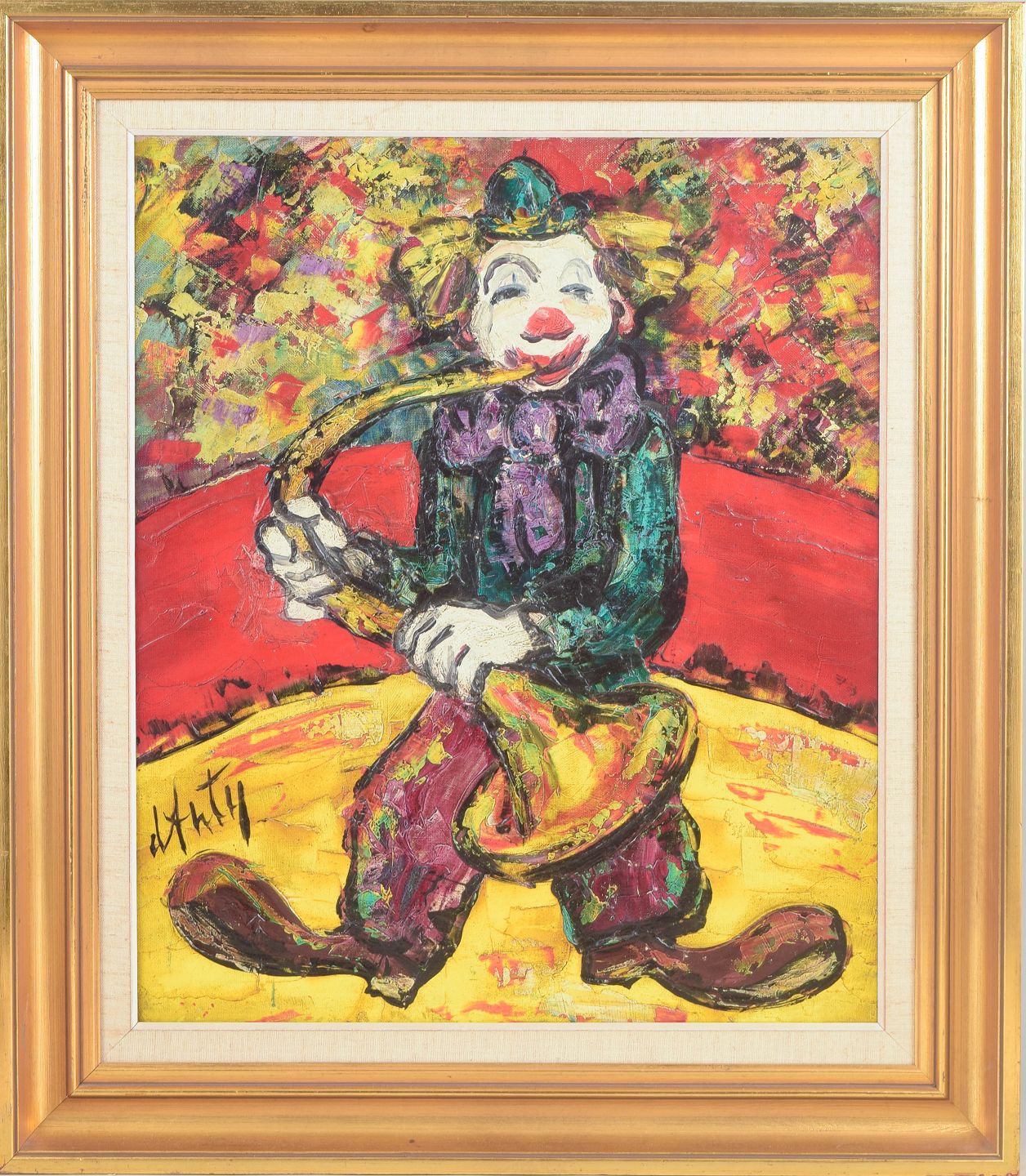 Farverig figurativ komposition med klovn, der spiller saxofon, udført i kraftige ekspressive penselstrøg og en intens palet domineret af røde, gule og grønne toner. Maleriet er signeret nederst og udført i kunstnerens karakteristiske stil med tykke lag maling og markerede konturer.