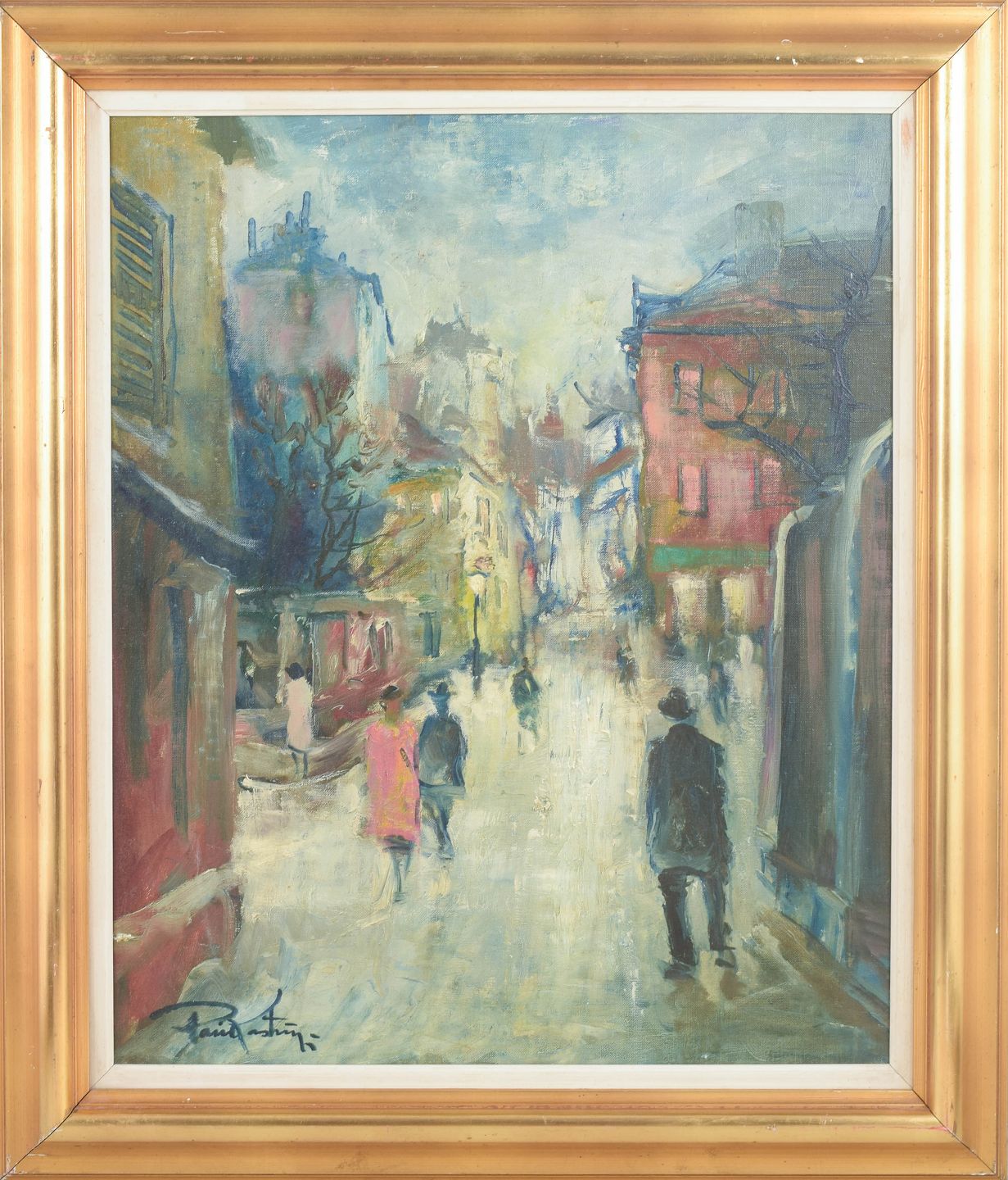 Impressionistisk gademotiv fra Montmartre i Paris med figurer i bevægelse langs en regnvåd boulevard, udført i en løs og atmosfærisk penselføring med dæmpede blå, okker og røde nuancer. Signeret Poul Kastrup.