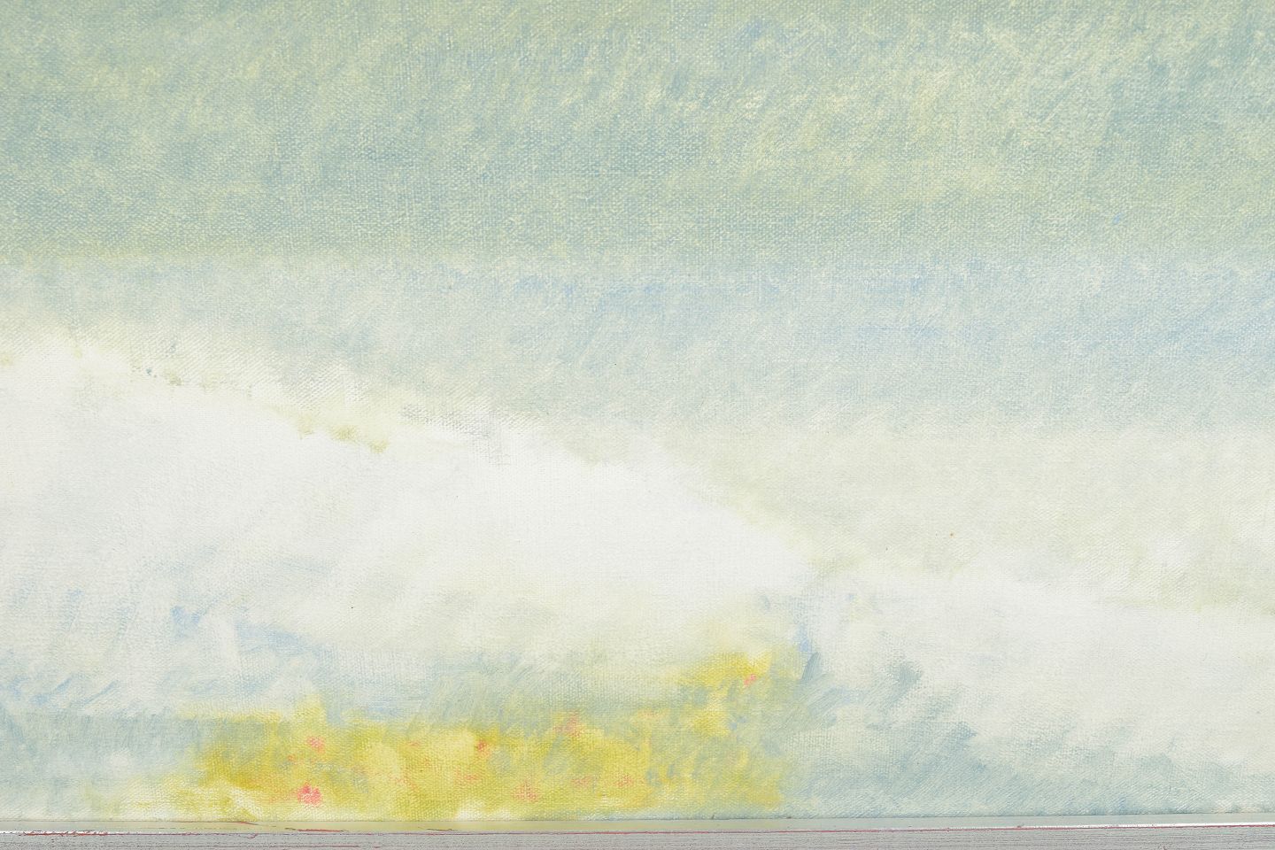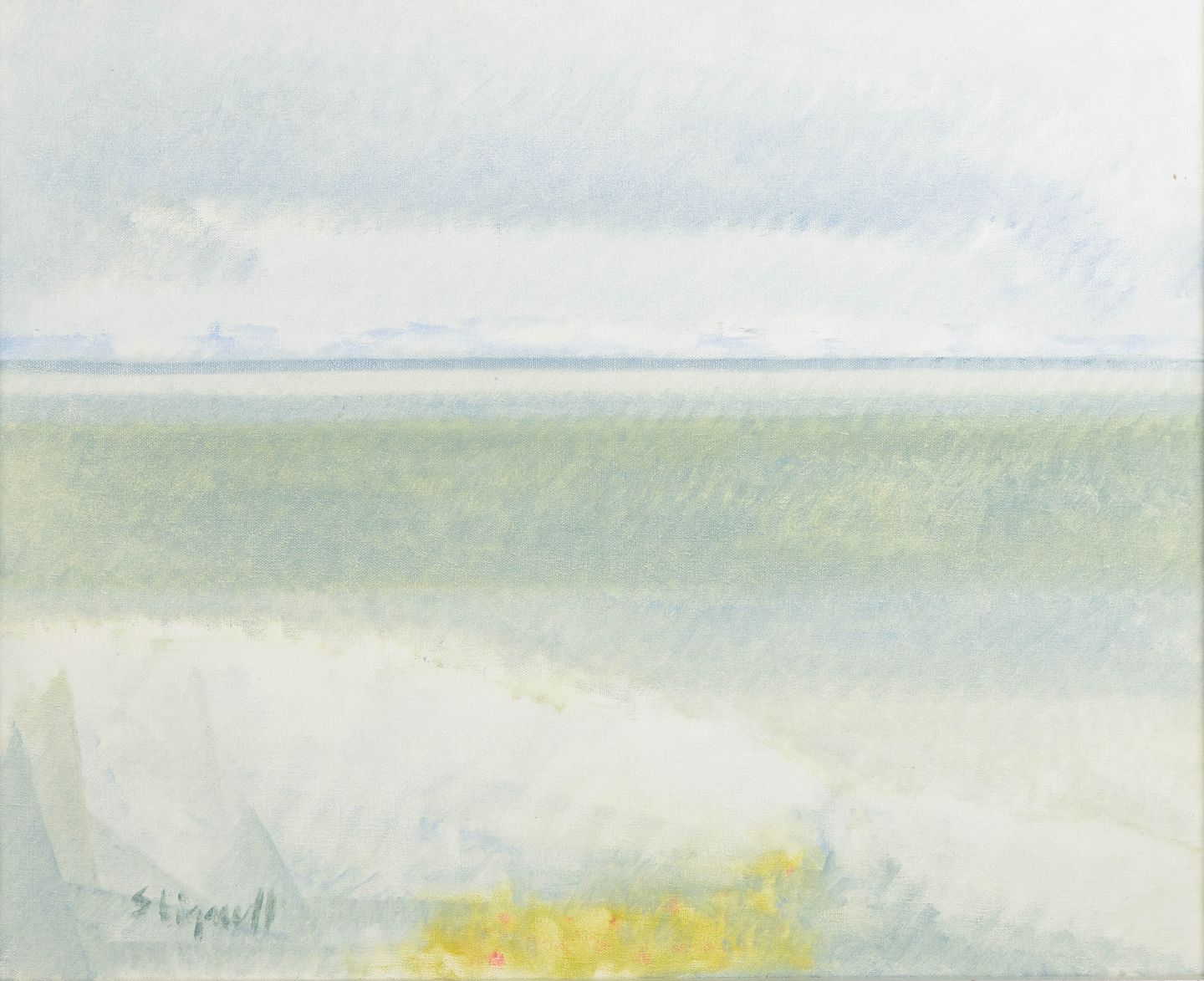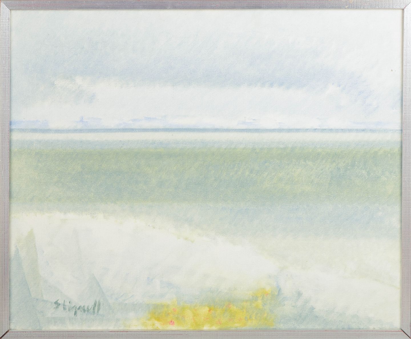 Landskabsmotiv udført i lyse, afdæmpede farver med en stiliseret gengivelse af kystlinje, hav og fjern horisont. Kompositionen er opbygget med brede farveflader og bløde overgange, hvilket giver værket en rolig og atmosfærisk karakter typisk for nordisk modernistisk landskabsmaleri fra midten af det 20. århundrede.