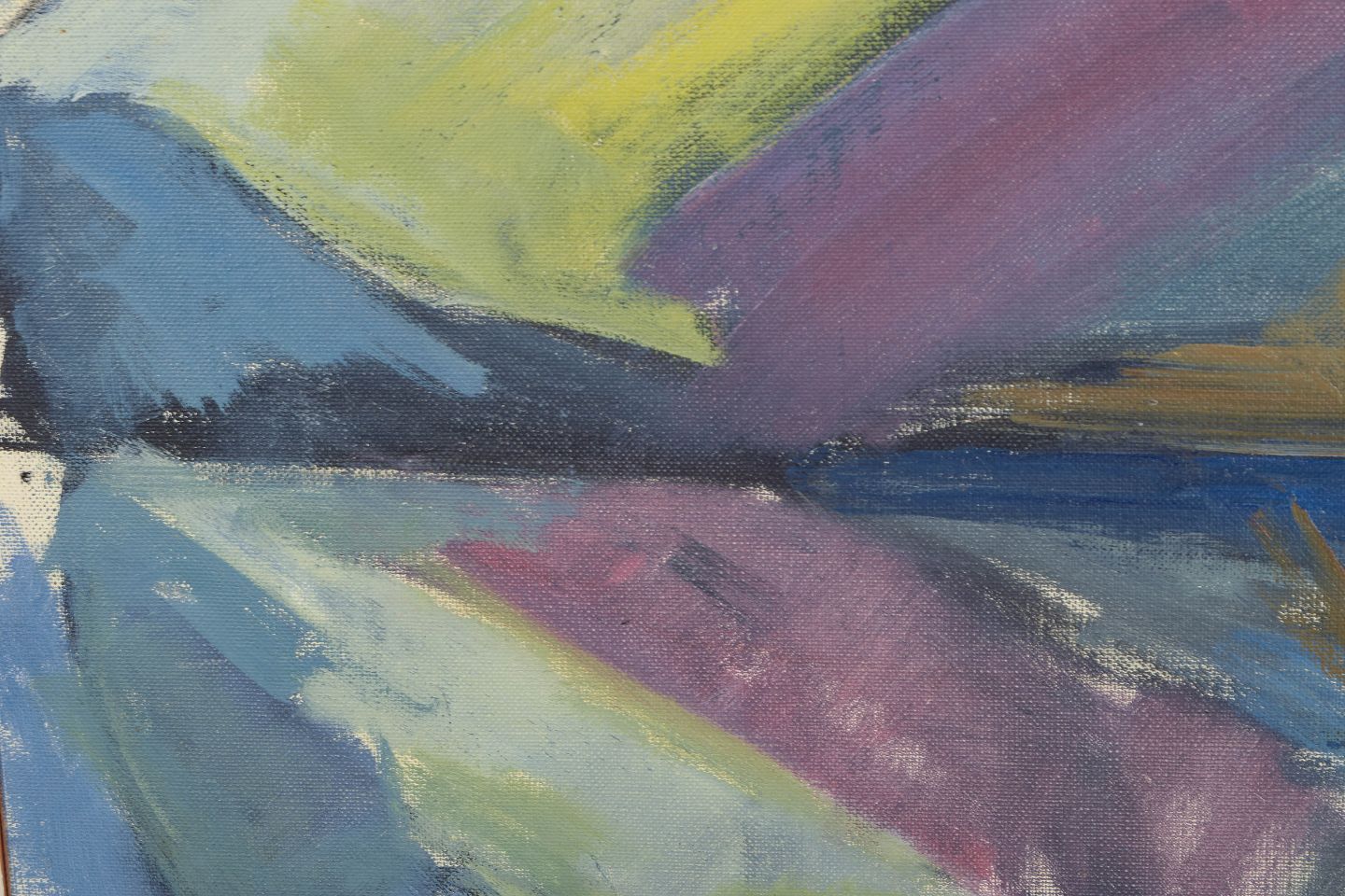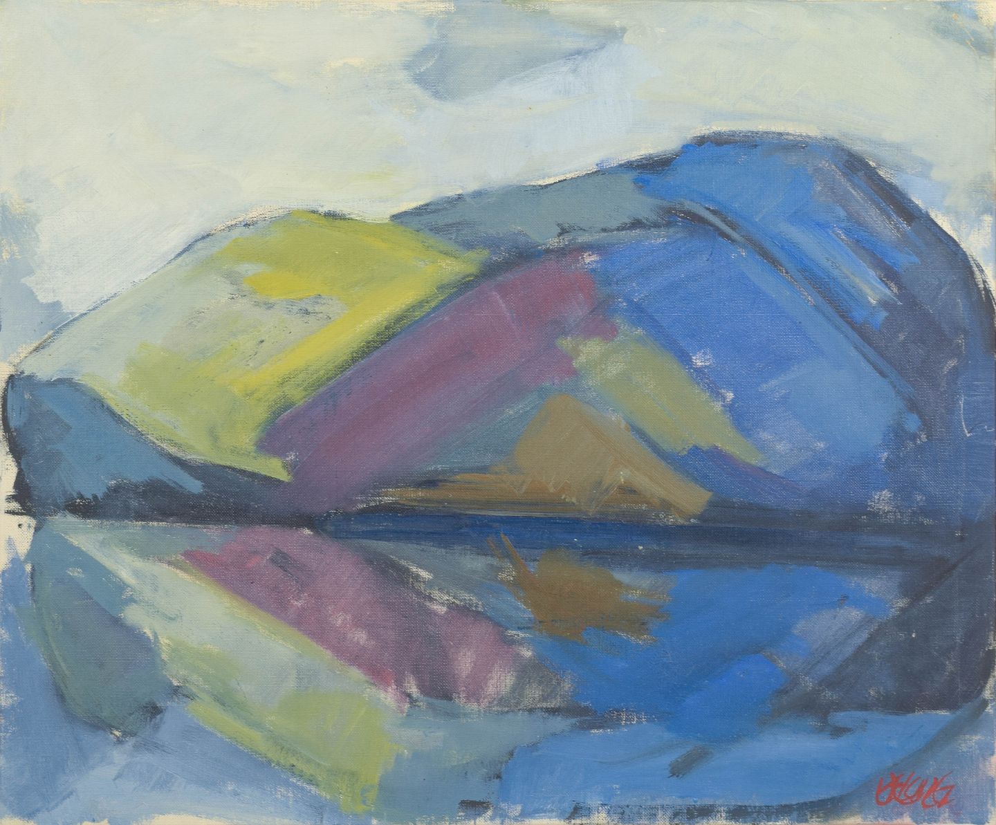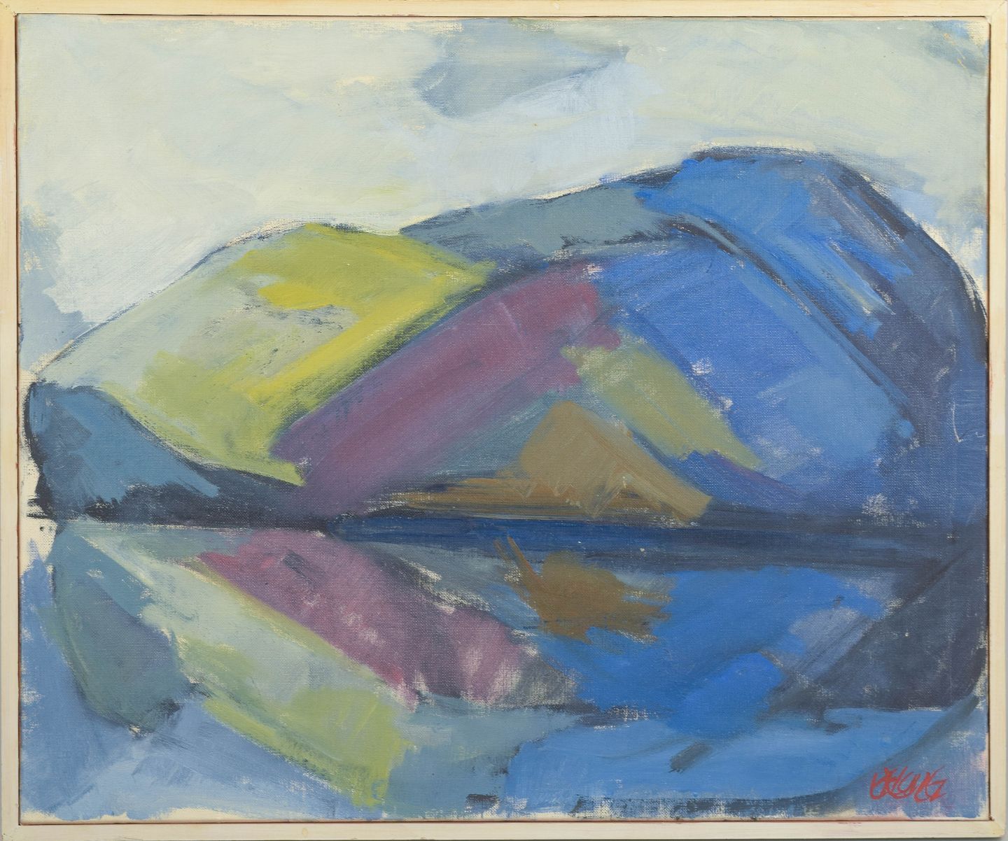 Modernistisk nordisk landskab med stiliserede former og spejling i vandflade, udført i brede penselstrøg og afdæmpede farver i blå, grønne og violette toner. Signeret.
