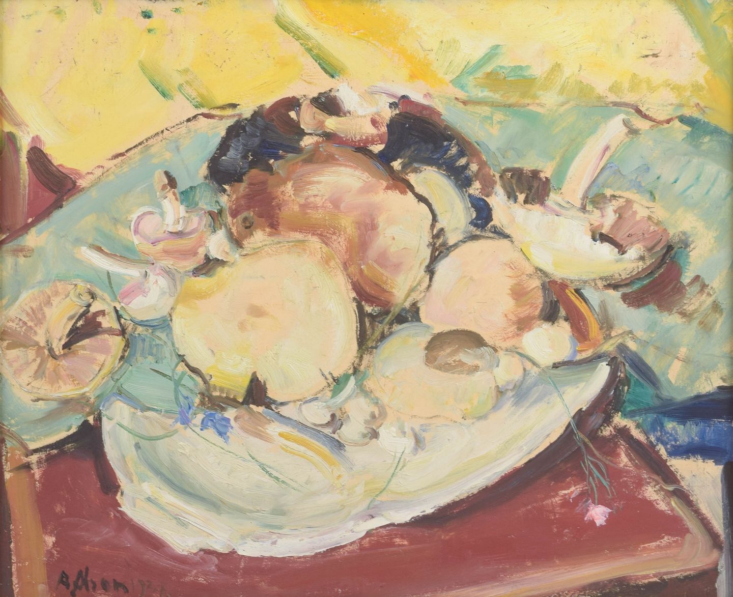 Ekspressivt stilleben med svampe arrangeret på fad, udført med brede og frie penselstrøg i varme gule, grønne og jordfarvede nuancer.