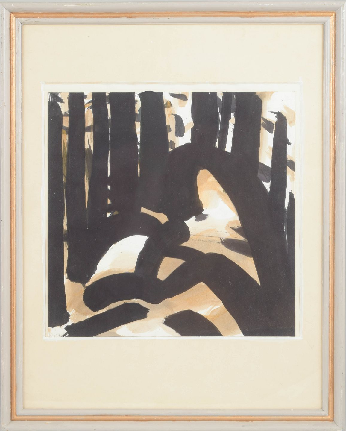 Abstrakt komposition med kraftige sorte penselstrøg og organiske former udført i mixed media på papir. Værket med titlen “Ljus glänta” er signeret og dateret 1987.