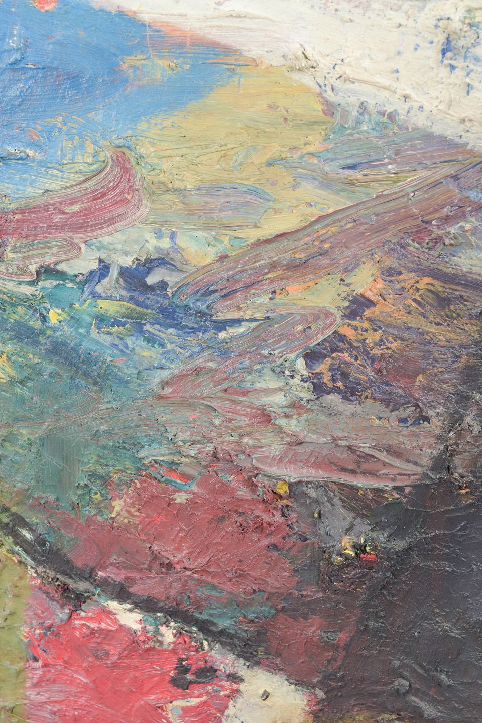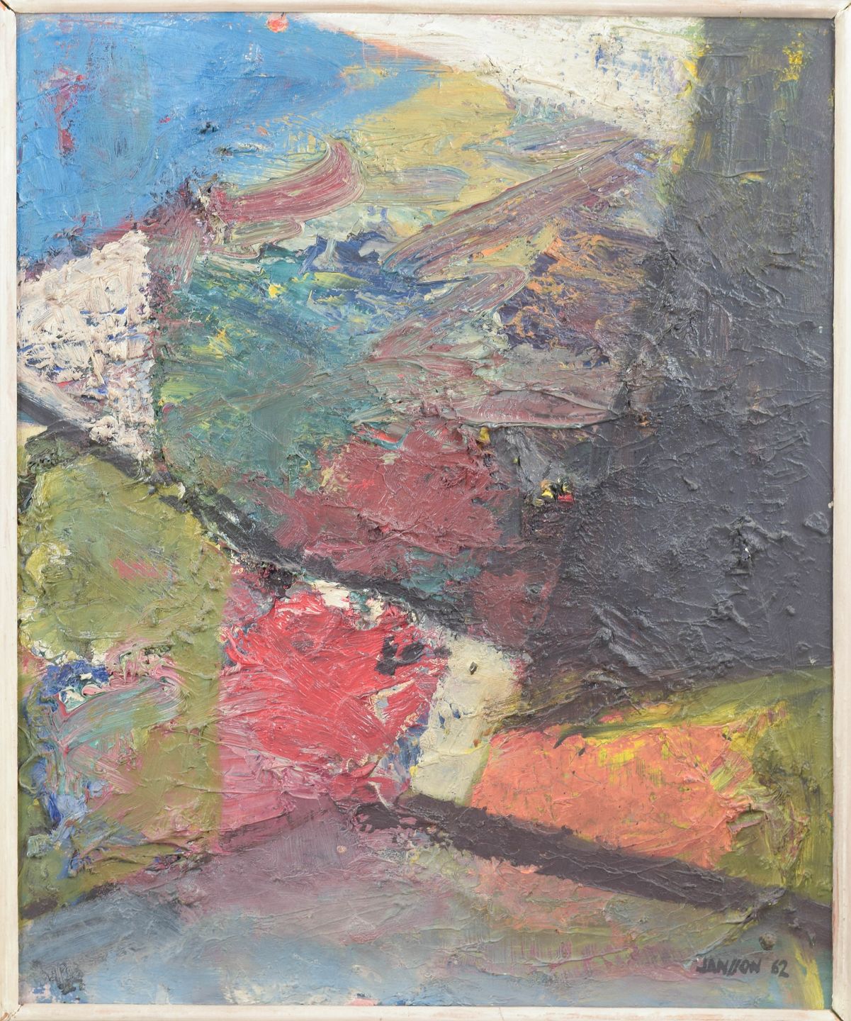 Abstrakt og ekspressiv komposition udført med kraftige penselstrøg og tyk farvepåføring i blå, røde, grønne og jordfarvede toner. Maleriet fremstår med en dynamisk struktur og tydelig materialitet i overfladen og er signeret samt dateret 1962.