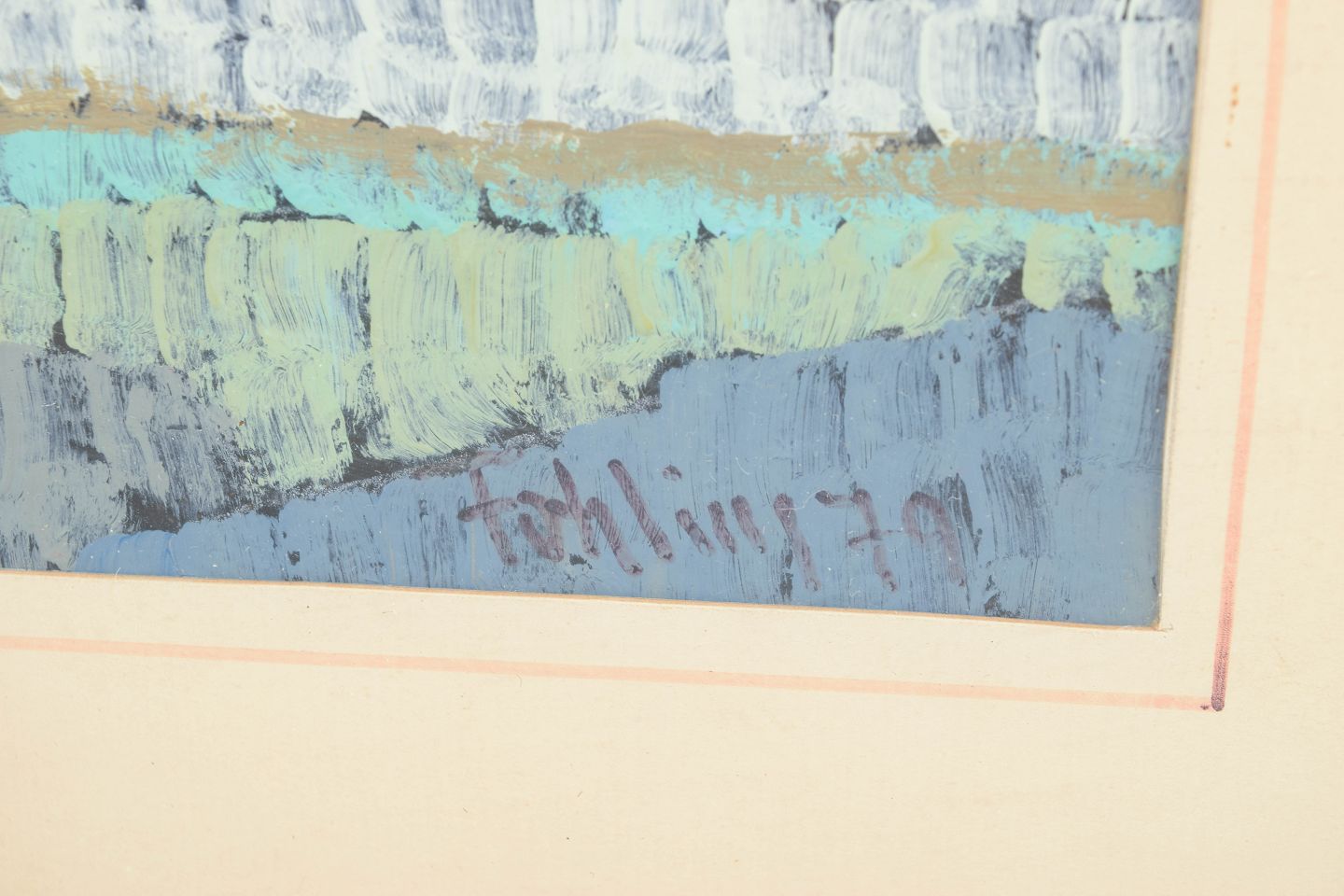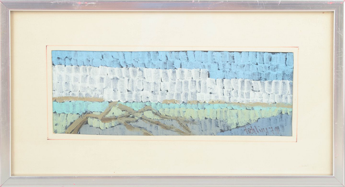 Abstrakt landskabskomposition udført i olie på papir med brede, strukturerede penselstrøg i lyse blå, hvide og jordfarvede toner. Kompositionen fremstår med horisontal opbygning, der leder tankerne mod et stiliseret kyst- eller landskabsmotiv.