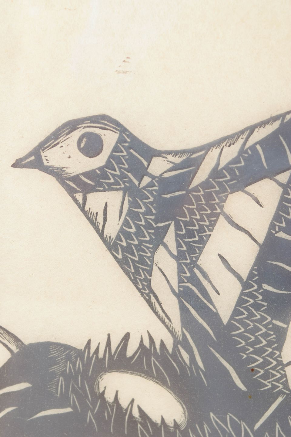 Grafisk motiv med stiliseret fugl udført som træsnit med markant sort-hvid kontrast og dekorative, organiske mønstre i fuglens fjerdragt.
