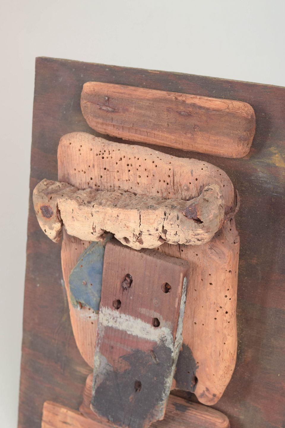 Abstrakt vægrelief udført som collage af forskellige træstykker monteret på træplade. Kompositionen består af drivtømmer-lignende fragmenter og groft bearbejdede træelementer med tydelige naturlige strukturer, patina og spor efter alder.