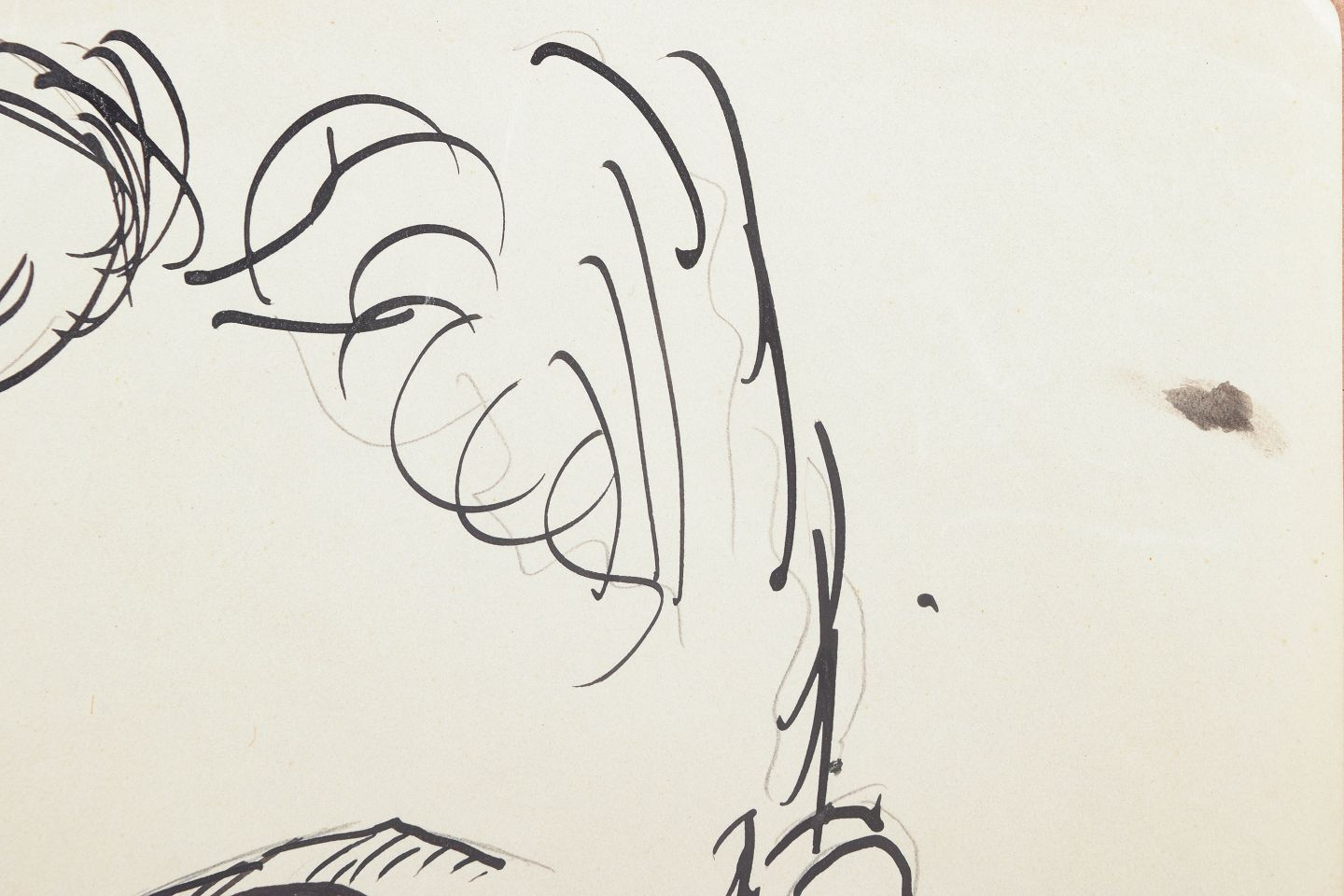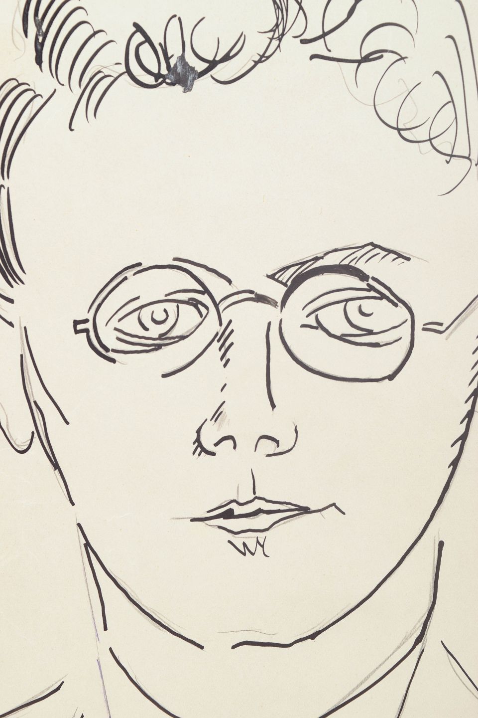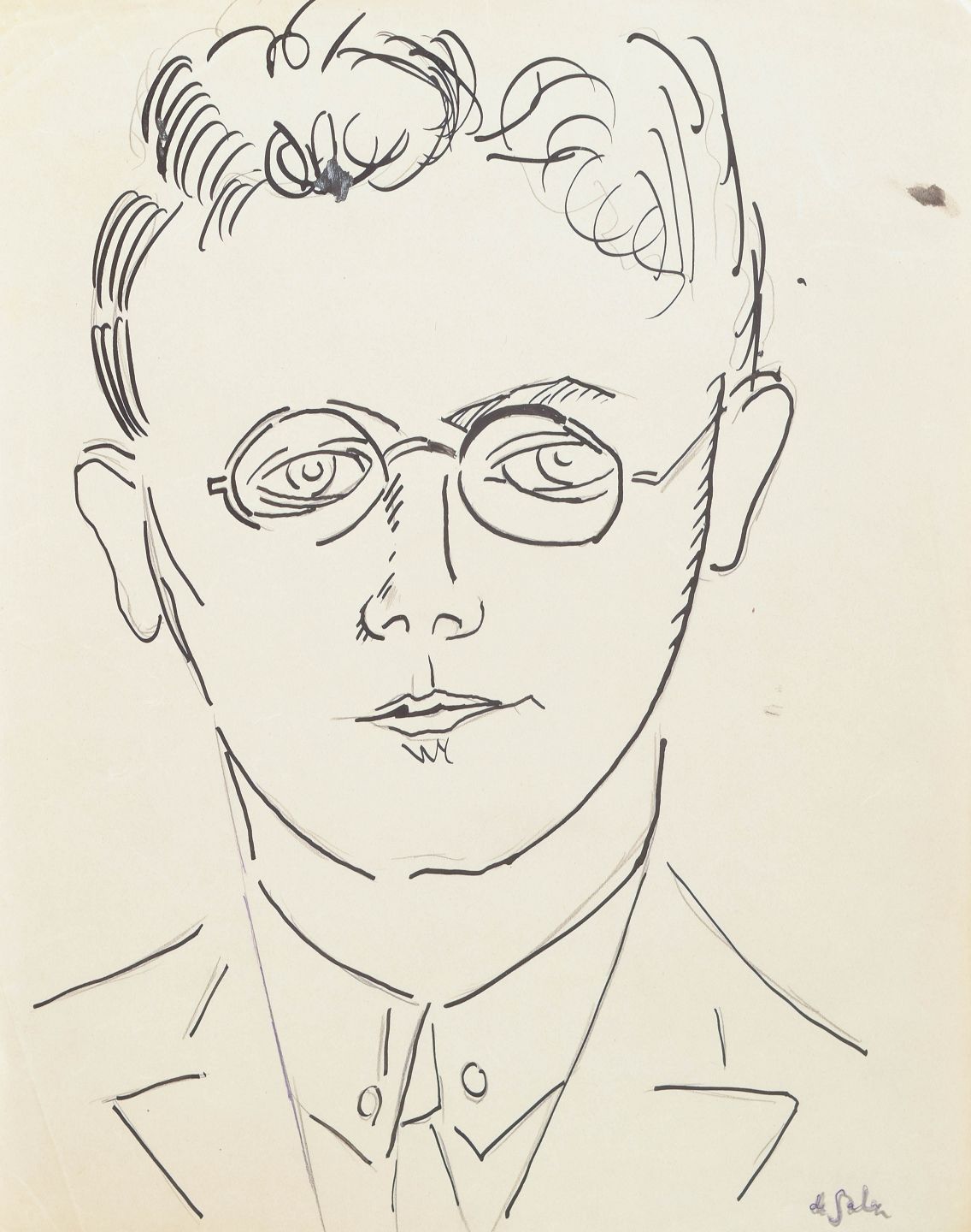 Art deco portrættegning udført på papir med klar og præcis linjeføring. Motivet viser et stiliseret mandsportræt med briller gengivet i en enkel grafisk streg, karakteristisk for 1930’ernes modernistiske tegnekunst.