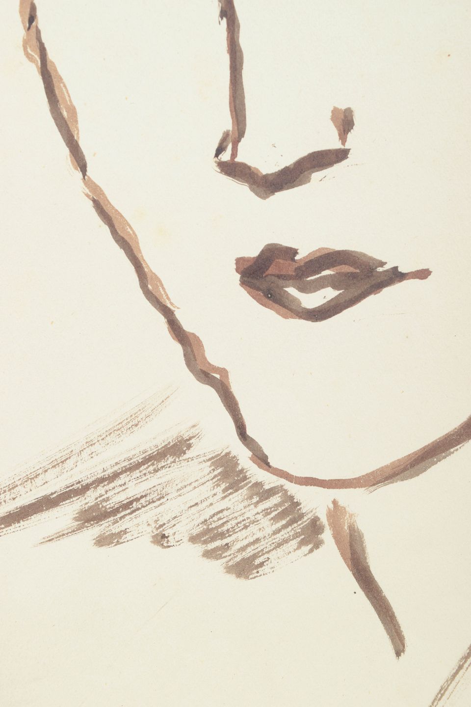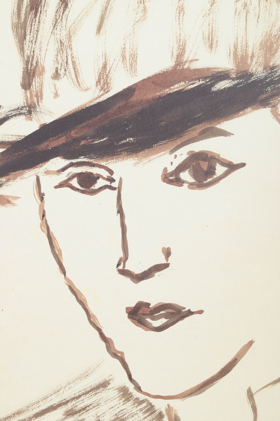 Art deco portrættegning udført på papir med frie, sikre pensel- og stregbevægelser. Motivet viser et stiliseret kvindeportræt med hat, gengivet i en enkel og elegant lineær stil typisk for 1930’ernes grafiske udtryk.