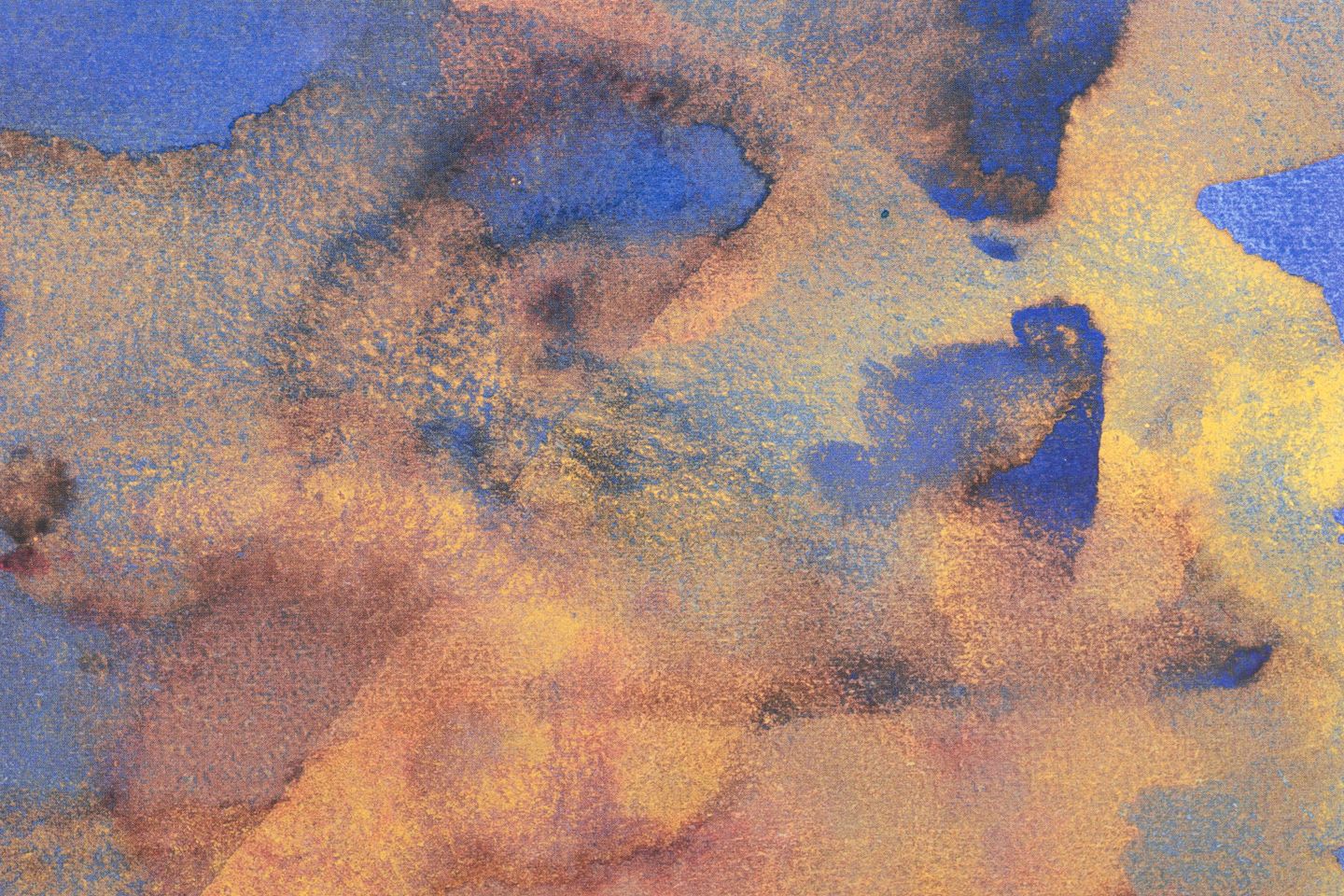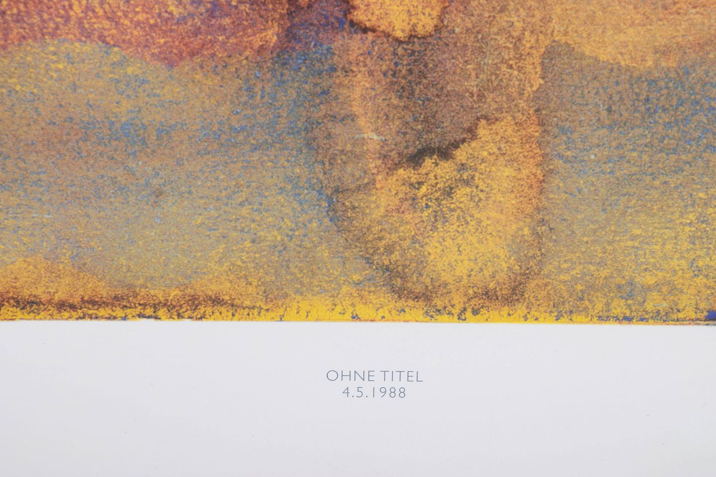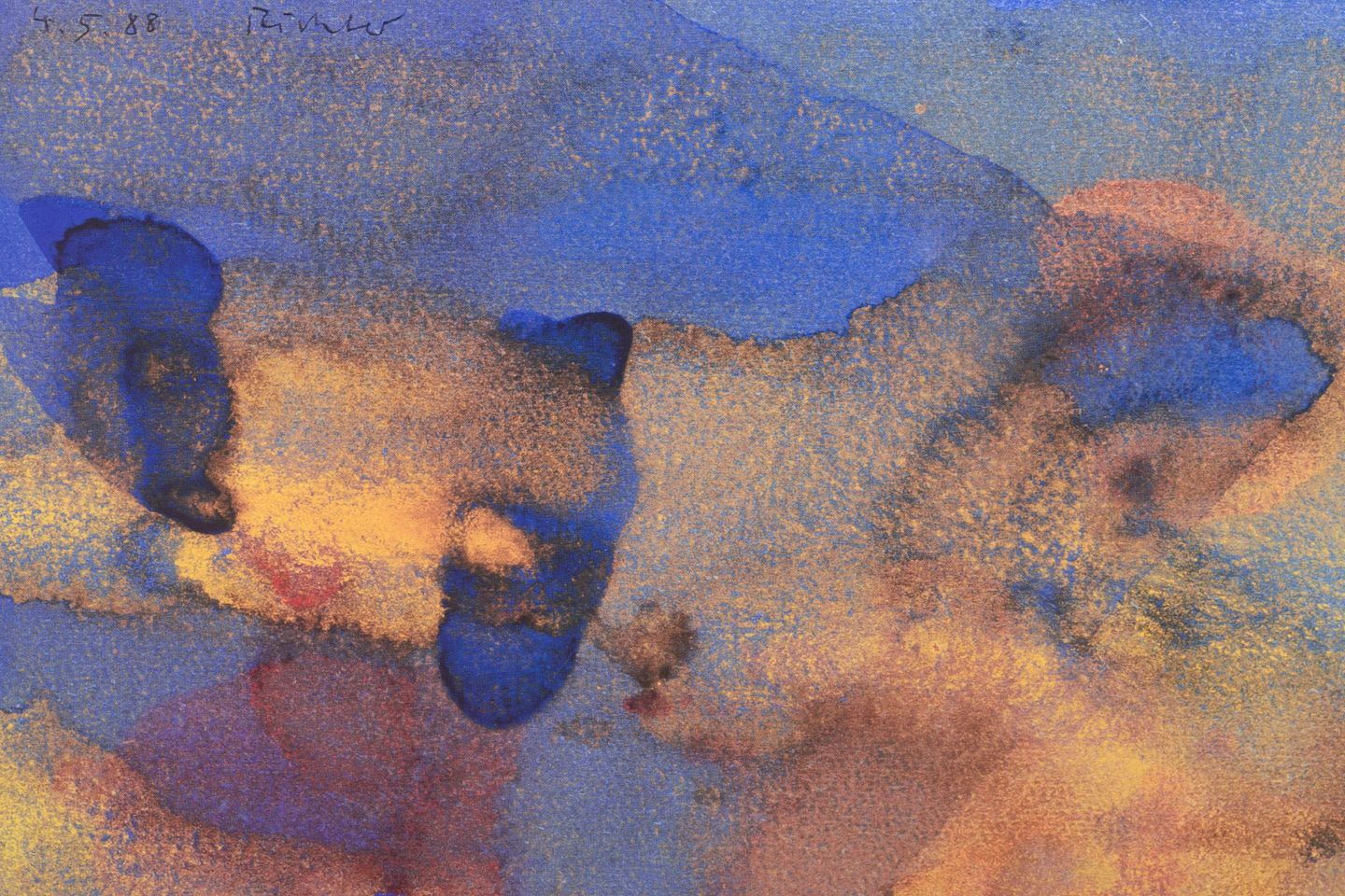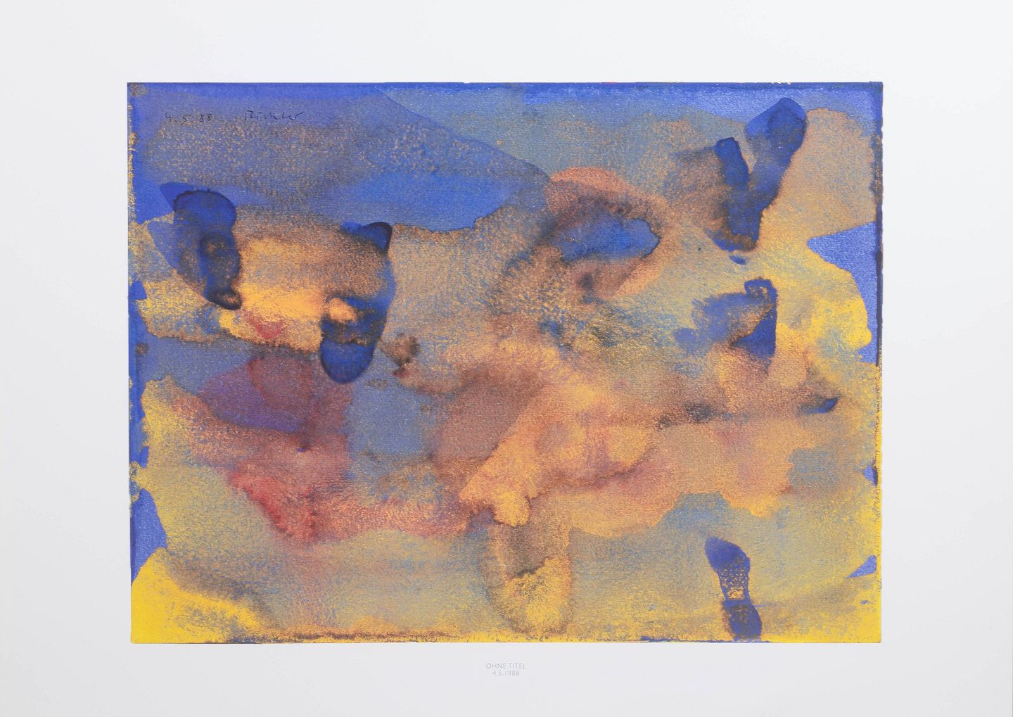 Abstrakt komposition udført som farvetryk i bløde overgange af blå, rosa, gule og beige toner. Signeret i trykket og dateret 1988.