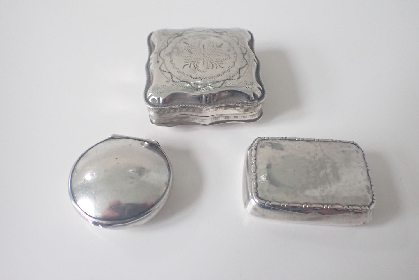 3 pilleæsker i sølv - en tysk og to danske.