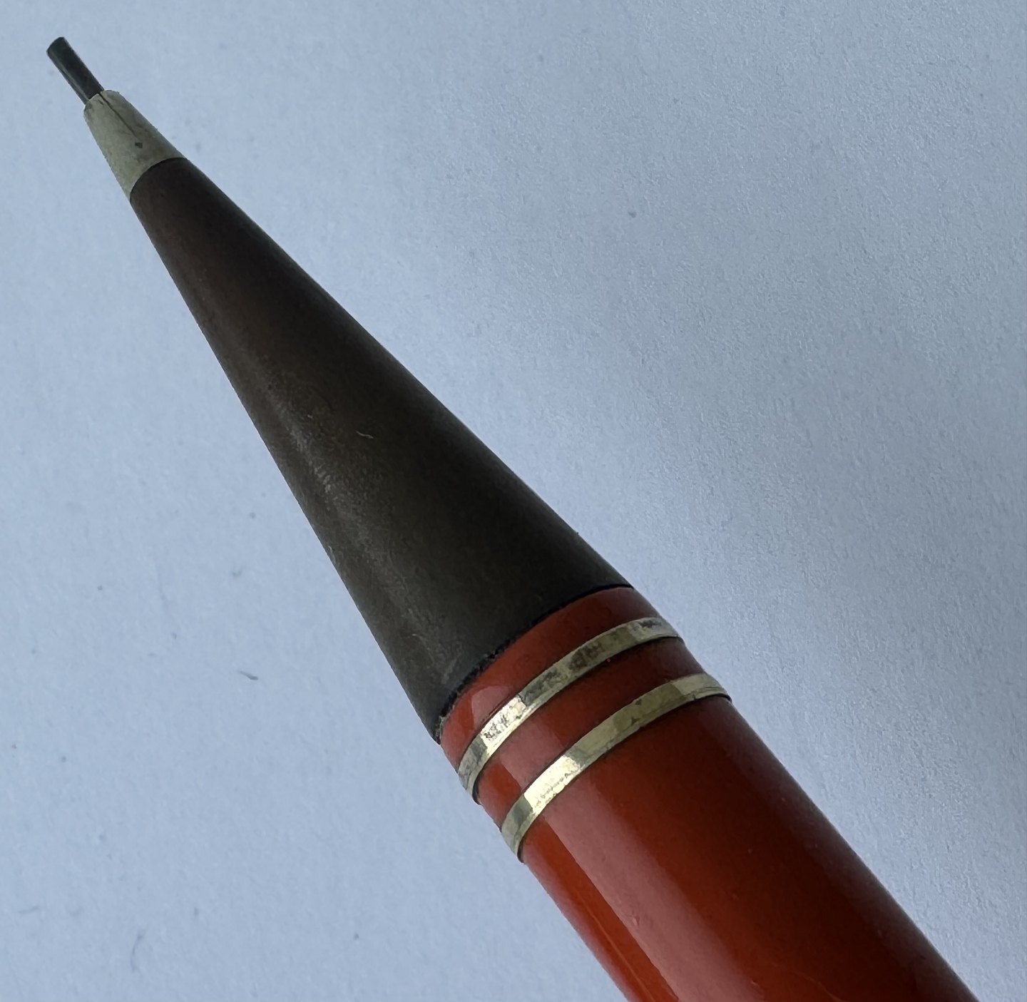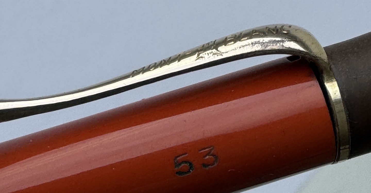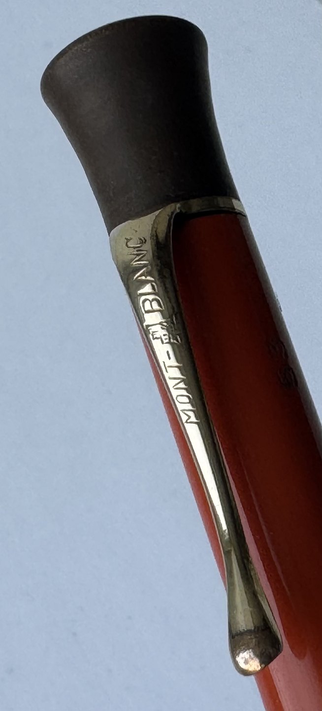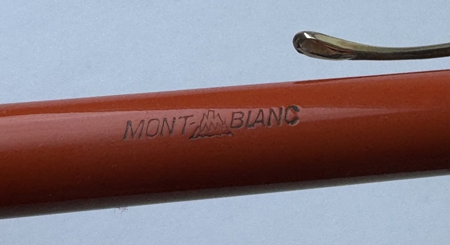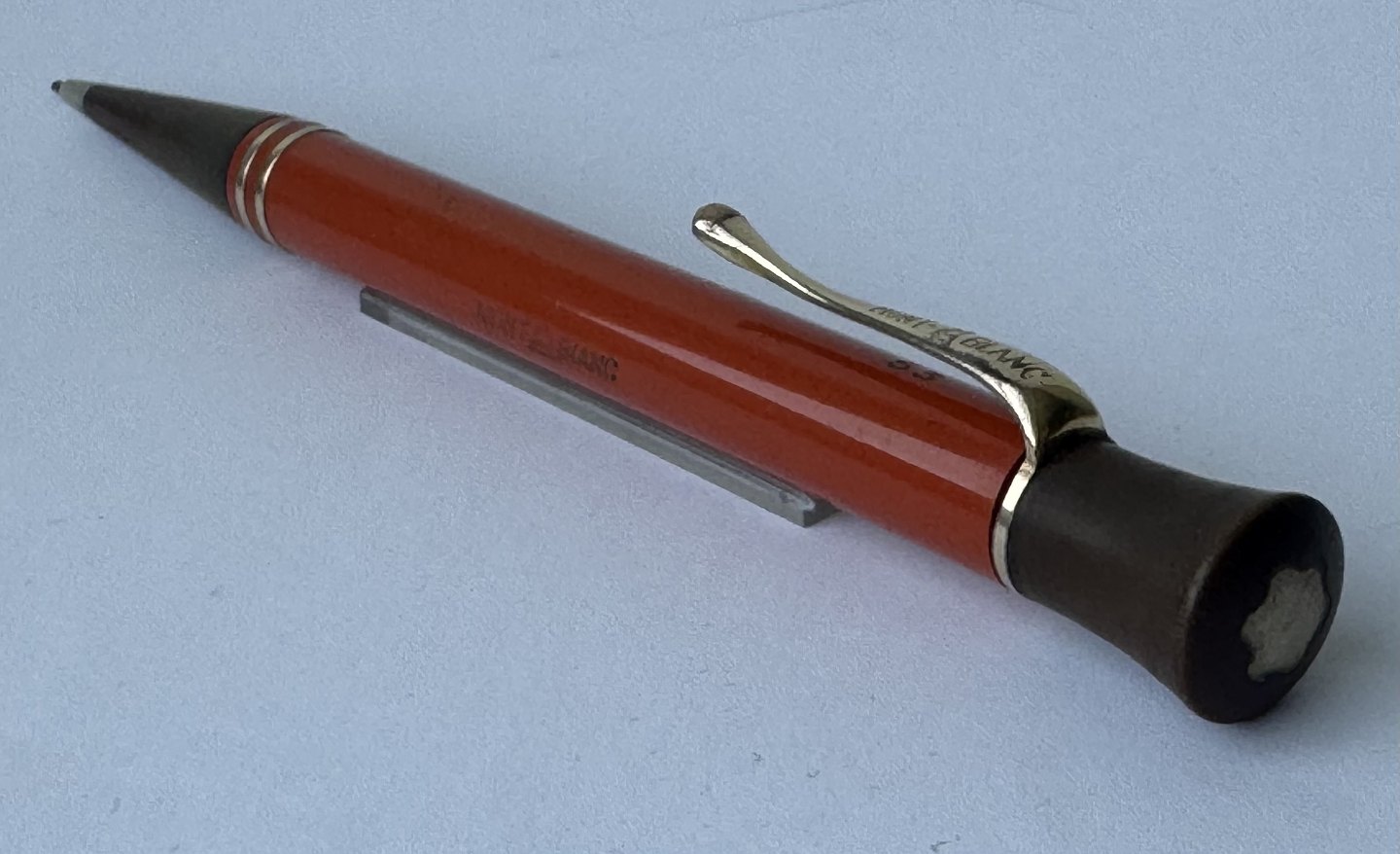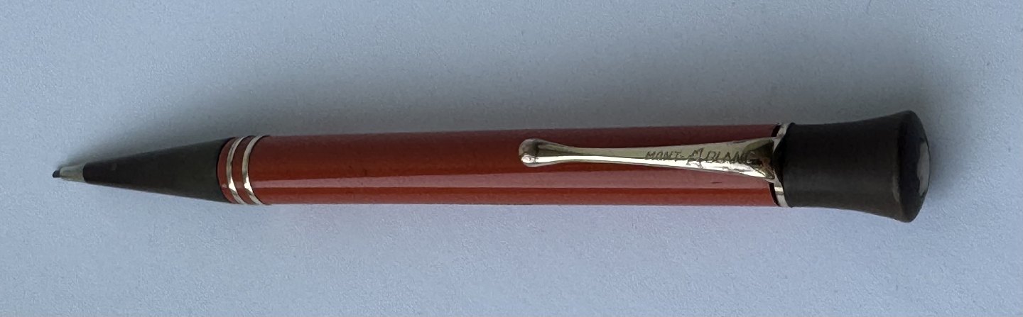 ART DECO PERIODEN: Koralrød Montblanc nr. 53 skrueblyant med stor indsat ben-hvid stjerne på toppen. Fremstillet i 1920’erne. Funktionsduelighed: Blyantsspidsen kan skrues ud, men skal have lidt hjælp til at blive skruet tilbage. Skrues ikke naturligt tilbage når der drejes kontra på toppen. Indprentet Fabriksnavn MONTBLANC samt modelnummer 53. I god stand uden skader. Mål: 13,5 cm lang