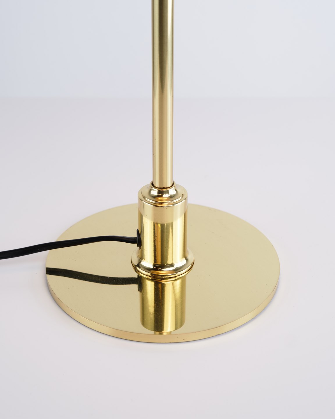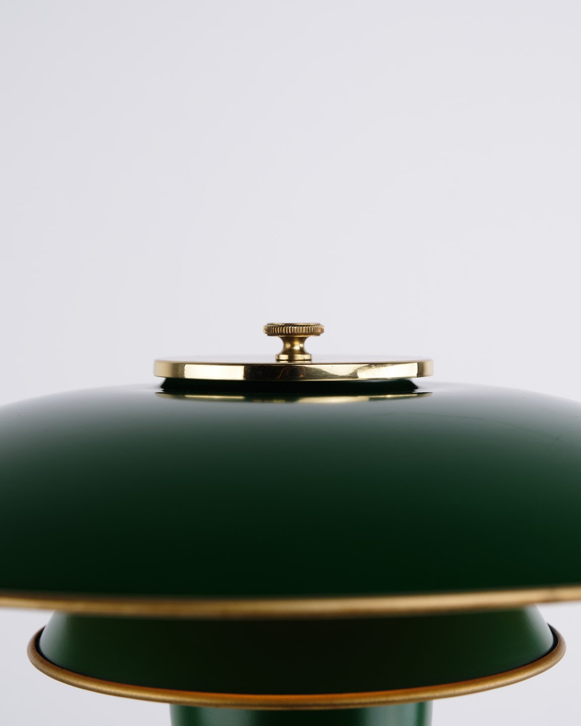 PH 3/2 Tischlampe, entworfen von Poul Henningsen und als Jubiläumsausgabe im Jahr 1996 von Louis Poulsen herausgegeben. Die Lampe ist aus Messing gefertigt und mit grünen Metallschirmen ausgestattet, was ihr einen markanten und klassischen Ausdruck verleiht. Das Modell wurde nur für einen begrenzten Zeitraum produziert und ist auch in einer Variante mit roten Metallschirmen erhältlich.