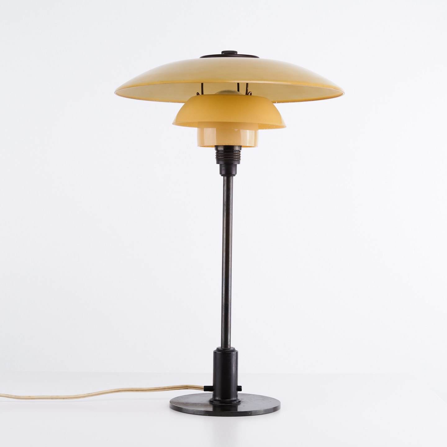 PH 3/2 Tischlampe, entworfen von Poul Henningsen und hergestellt von Louis Poulsen in den 1930er Jahren. Die Lampe ist mit einlagig gelb lackierten Schirmen ausgeführt, die ein warmes und angenehmes Licht erzeugen. Das ikonische Dreischirmsystem wurde entwickelt, um eine optimale Lichtverteilung zu gewährleisten und Blendung zu minimieren.