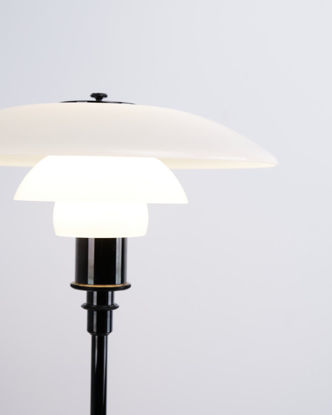 PH 3,5/2,5 Stehlampe, entworfen von Poul Henningsen und hergestellt von Louis Poulsen. Die Lampe ist mit einem schwarz lackierten Gestell und Schirmen aus weißem Opalglas ausgeführt, was ihr einen eleganten und ausgewogenen Ausdruck verleiht. Das ikonische Dreischirmsystem sorgt für ein weiches, blendfreies Licht und eine gleichmäßige Lichtverteilung.