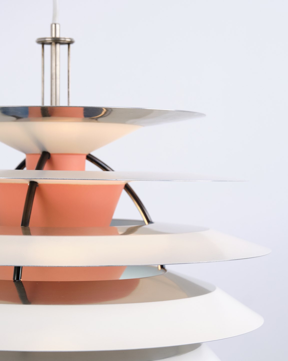 PH Kontrast Pendelleuchte, entworfen von Poul Henningsen und hergestellt von Louis Poulsen in den 1980er Jahren. Die Leuchte ist mit mehreren gegeneinander gerichteten Schirmen aufgebaut, die ein dynamisches Spiel von Licht und Schatten erzeugen. Die Konstruktion sorgt für ein weiches, indirektes Licht und verleiht der Leuchte zugleich einen skulpturalen Ausdruck.