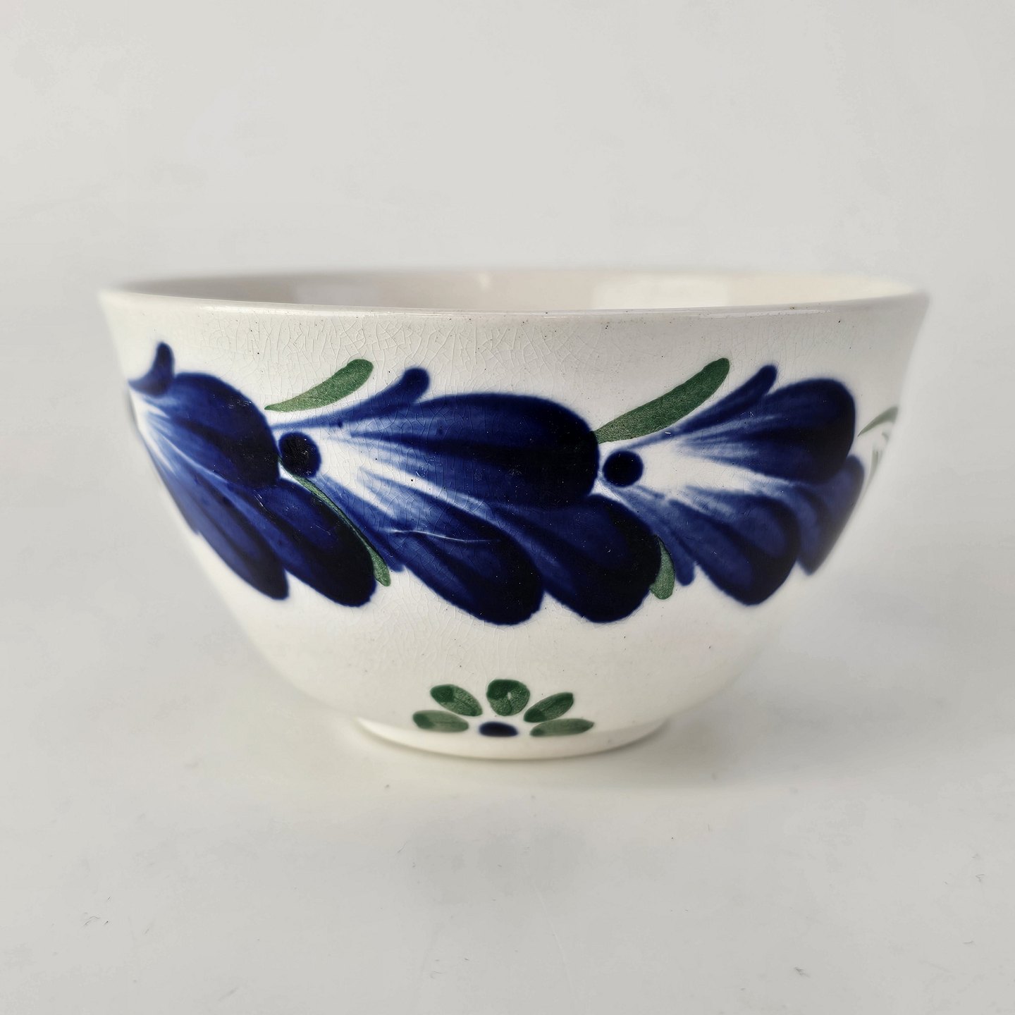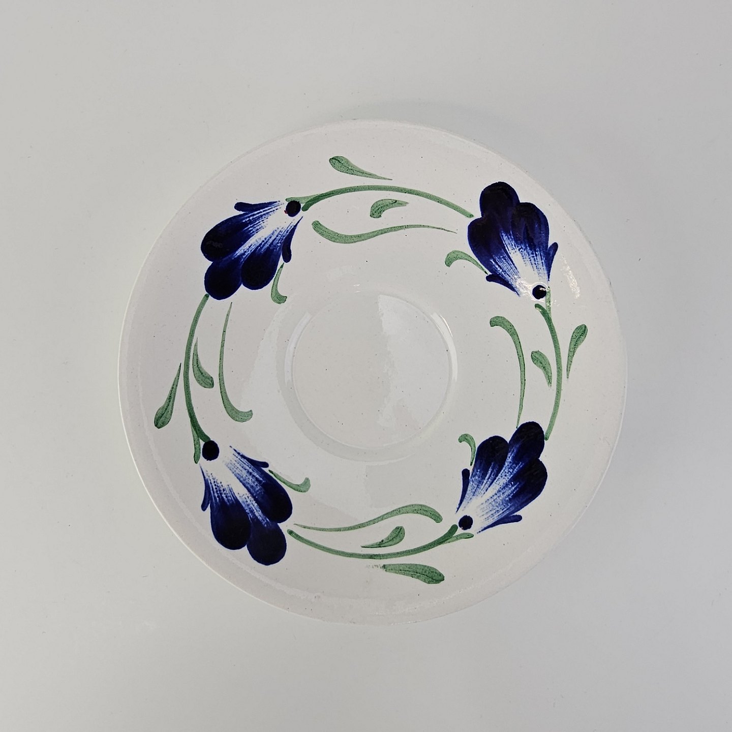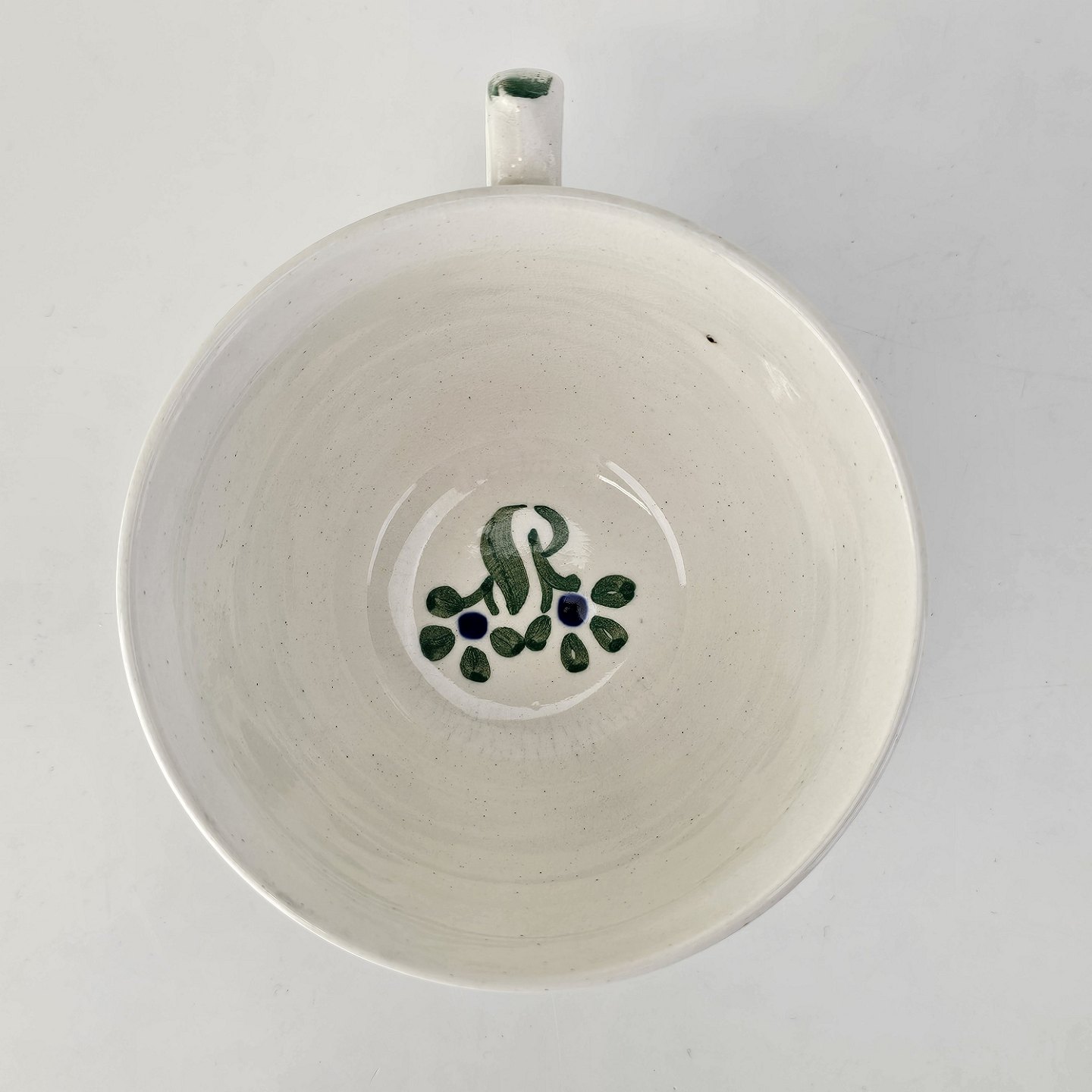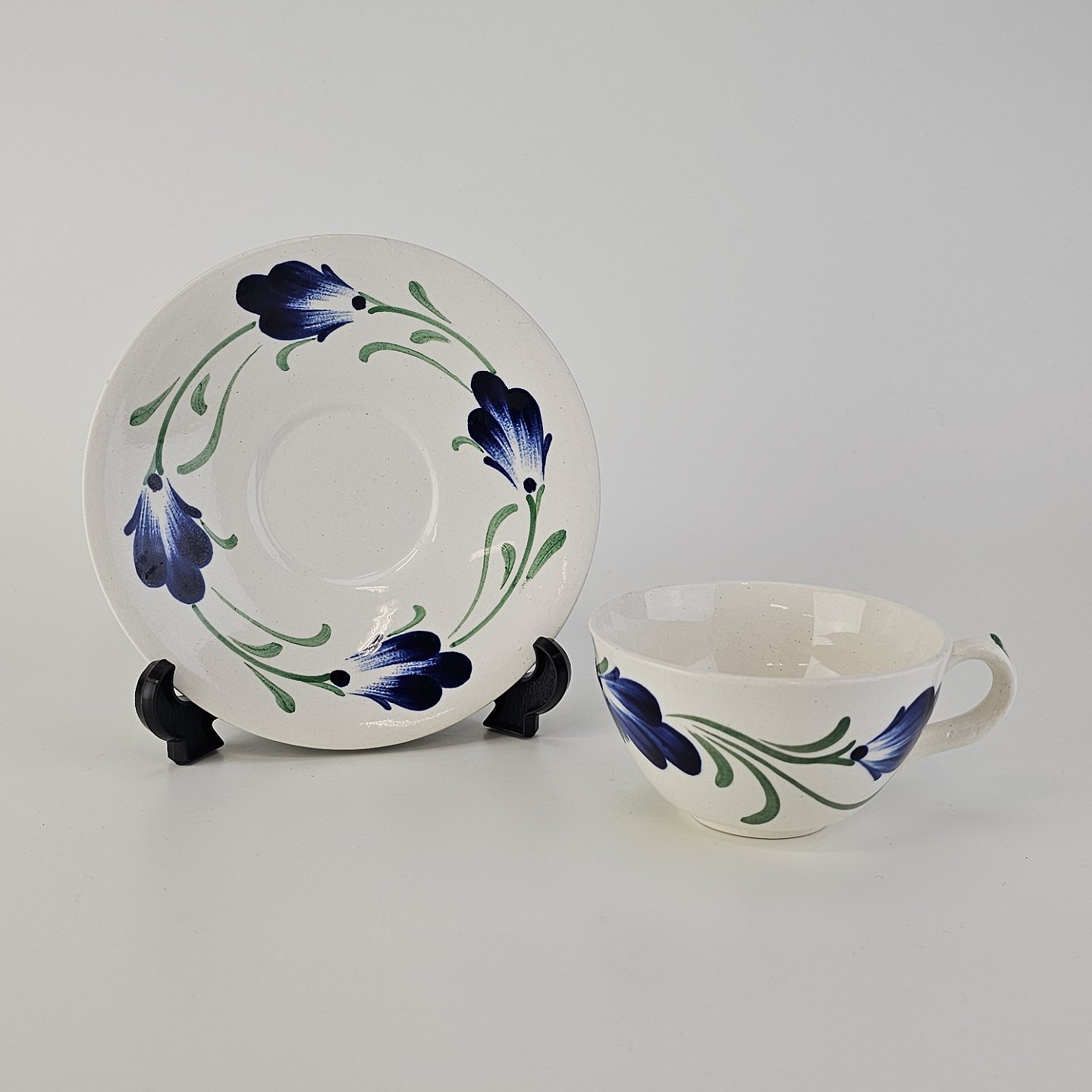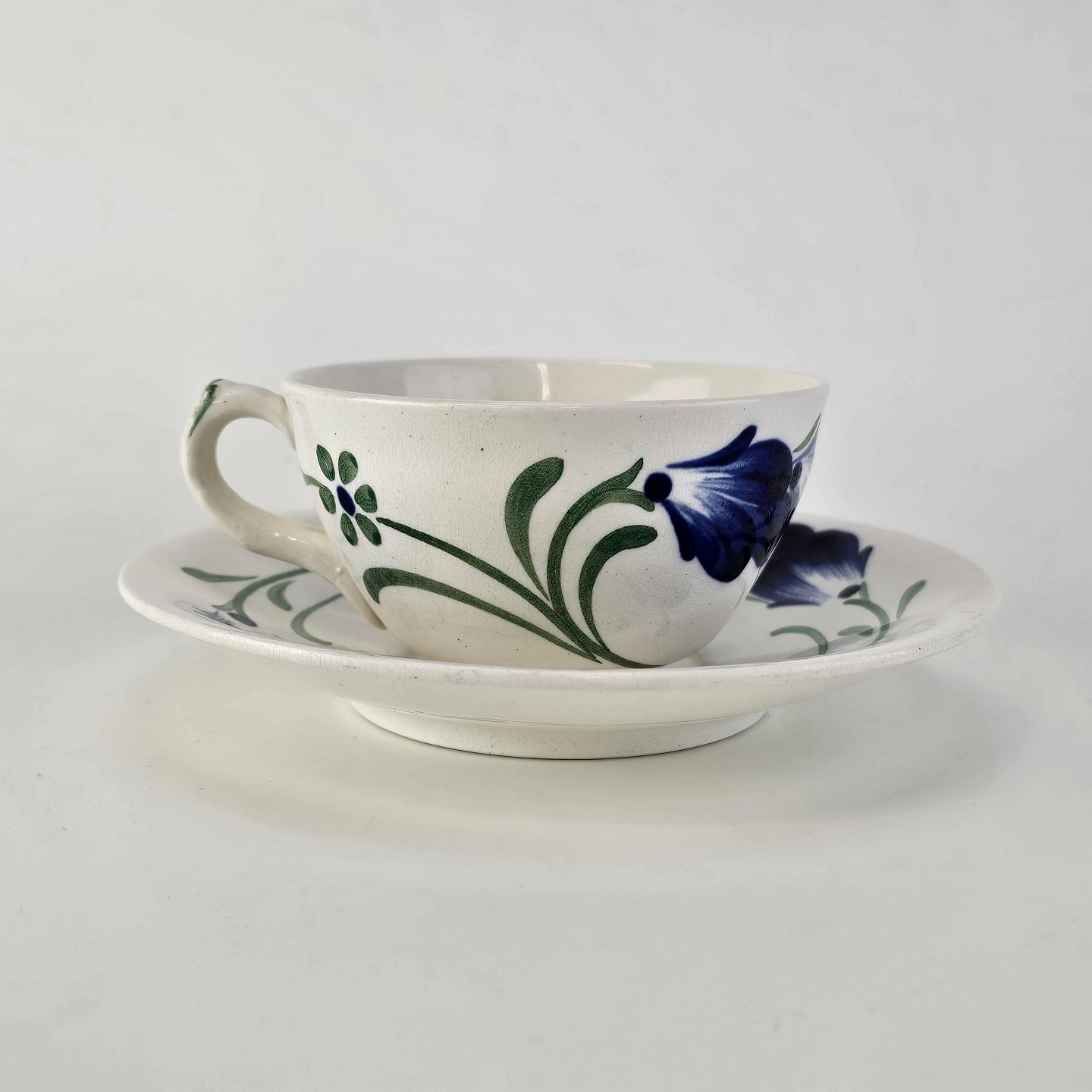 Kop med underkop i hvid fajance fra stellet Blå Cenerarier